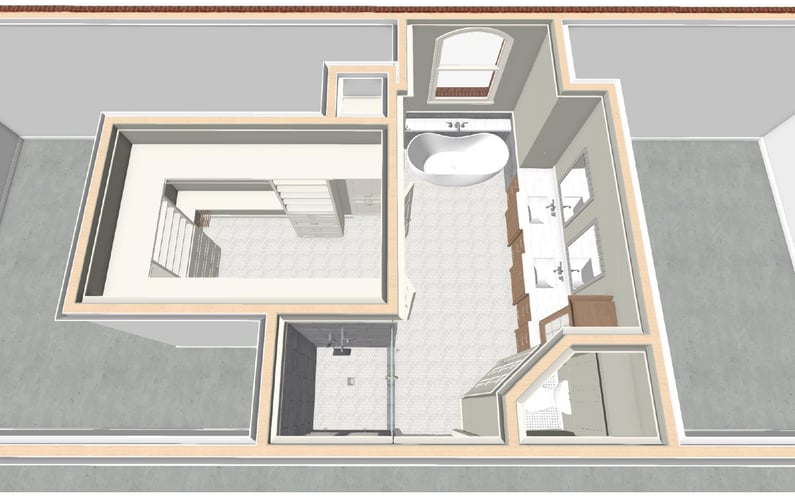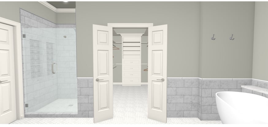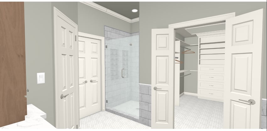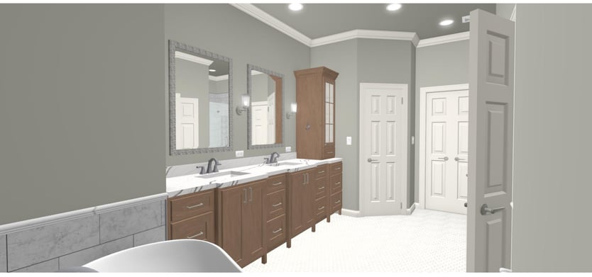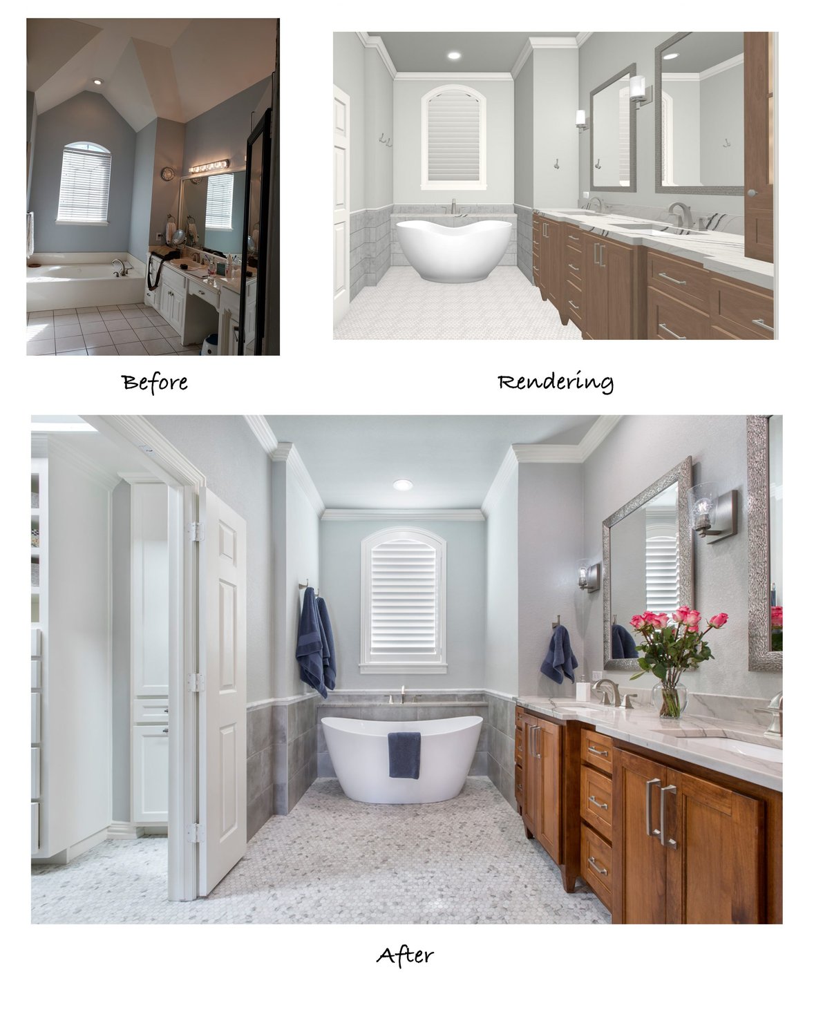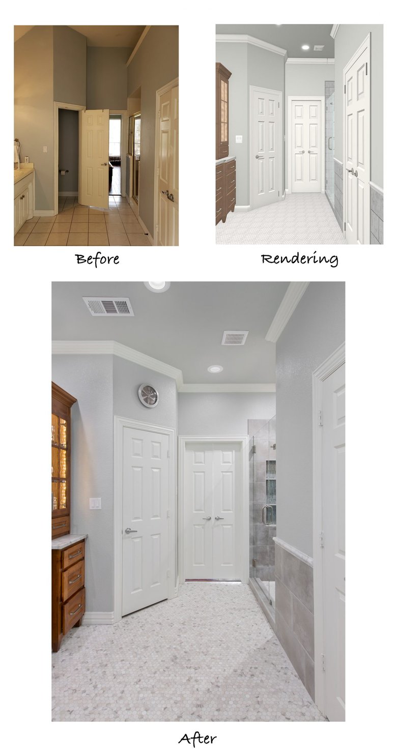 Our clients discussed their ideas with our designers and shared some inspiration photos they had collected online. Our draftsman drew the existing floor plan, followed by the proposed design, including notes about the specific changes to be made. The revised floor plans were accompanied by detailed 3D renderings, allowing the clients to experience a virtual walk-through of their new bathroom. This visual portion of our custom design package always provides a great communication tool between our designers and the clients, ensuring we’re all on the same page about how the finished remodel will look and function.