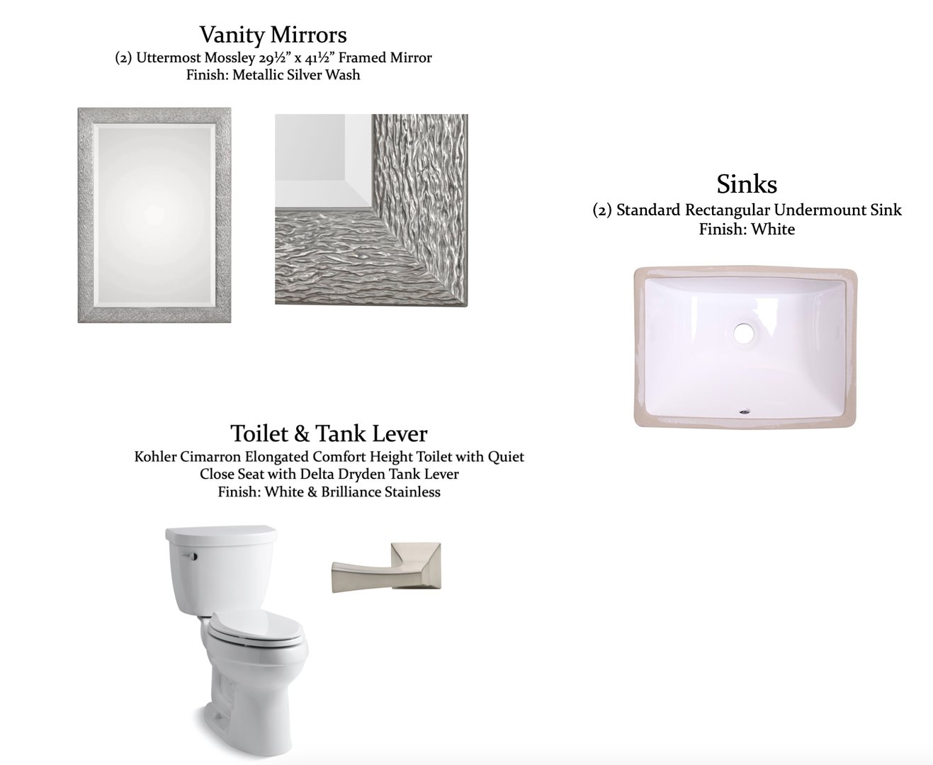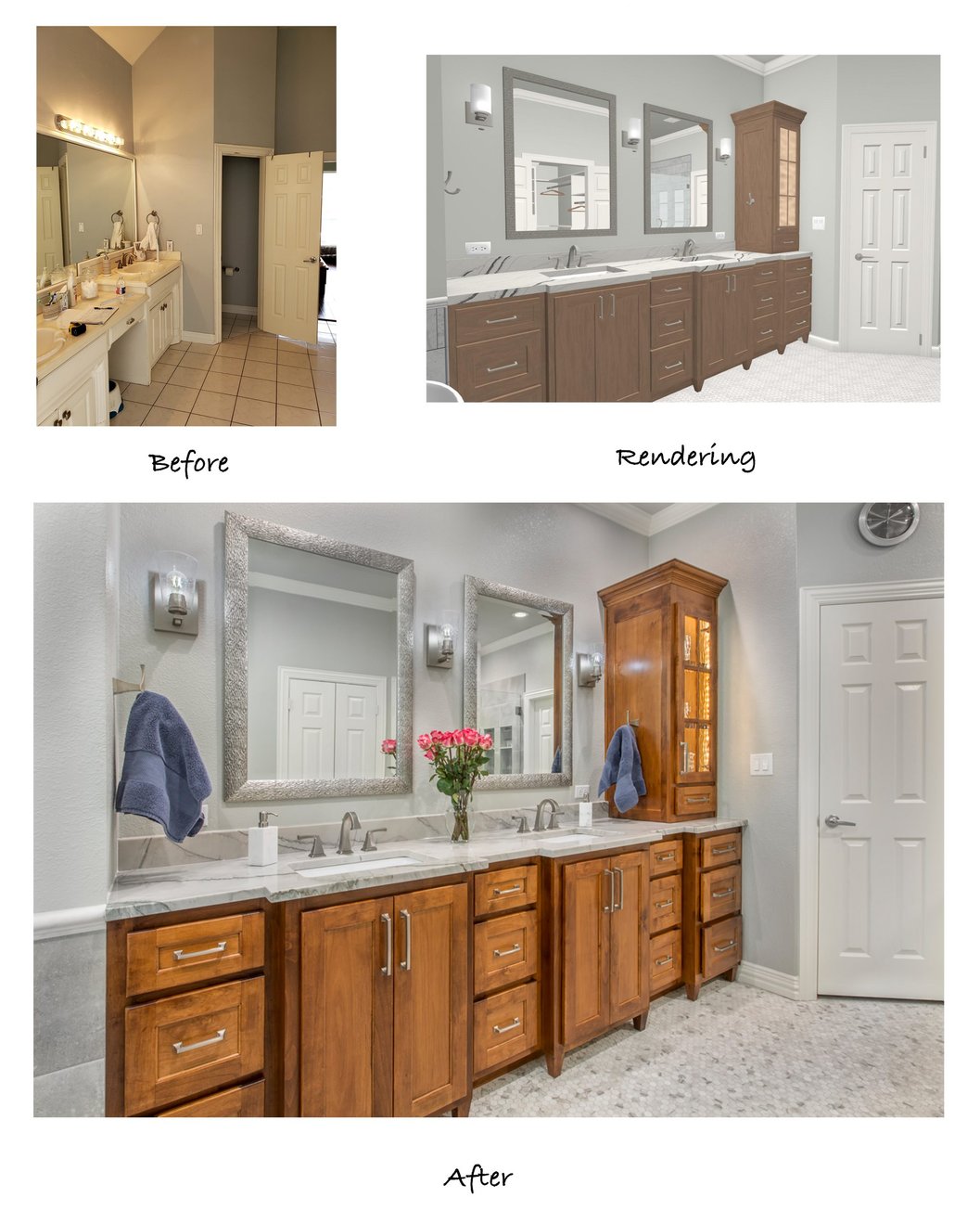 The vanity style was a typical 1990’s design with fluted corners, different level sink areas, a sitting vanity area, false drawer fronts at the sinks, a single large mirror with strip lighting, and 12” floor tiles. Our designers drew up a custom vanity that included ample storage space and a more modern, timeless look to meet the client’s needs and create the aesthetic style they hoped for.