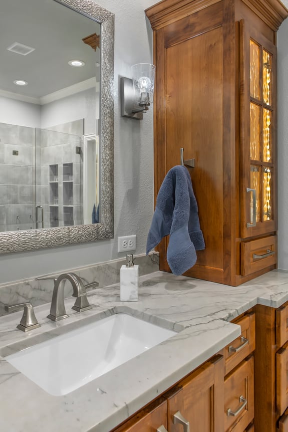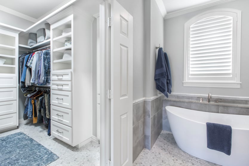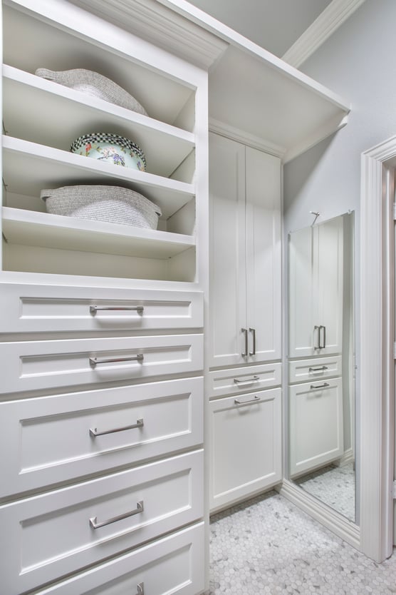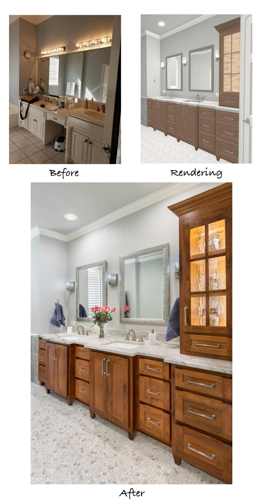 27 years old may sound young, but certainly not when you’re talking about the age of a bathroom! Our recent clients in Colleyville, Texas, came to us at the end of last year with hopes of renovating their 1993 master bathroom. The original bathroom was a good size and was fully functional, but the clients felt the aesthetic needed a refresh to match the rest of their beautiful home. Along with a new look, they specified the need for more storage space, both in the vanity area and in the master walk-in closet. The number of drawers, cabinets, and shelving may seem like minor details, but these are the types of things that impact the way you use your space on a daily basis. You don’t always have to change the floor plan or make huge structural modifications to make your home more functional!