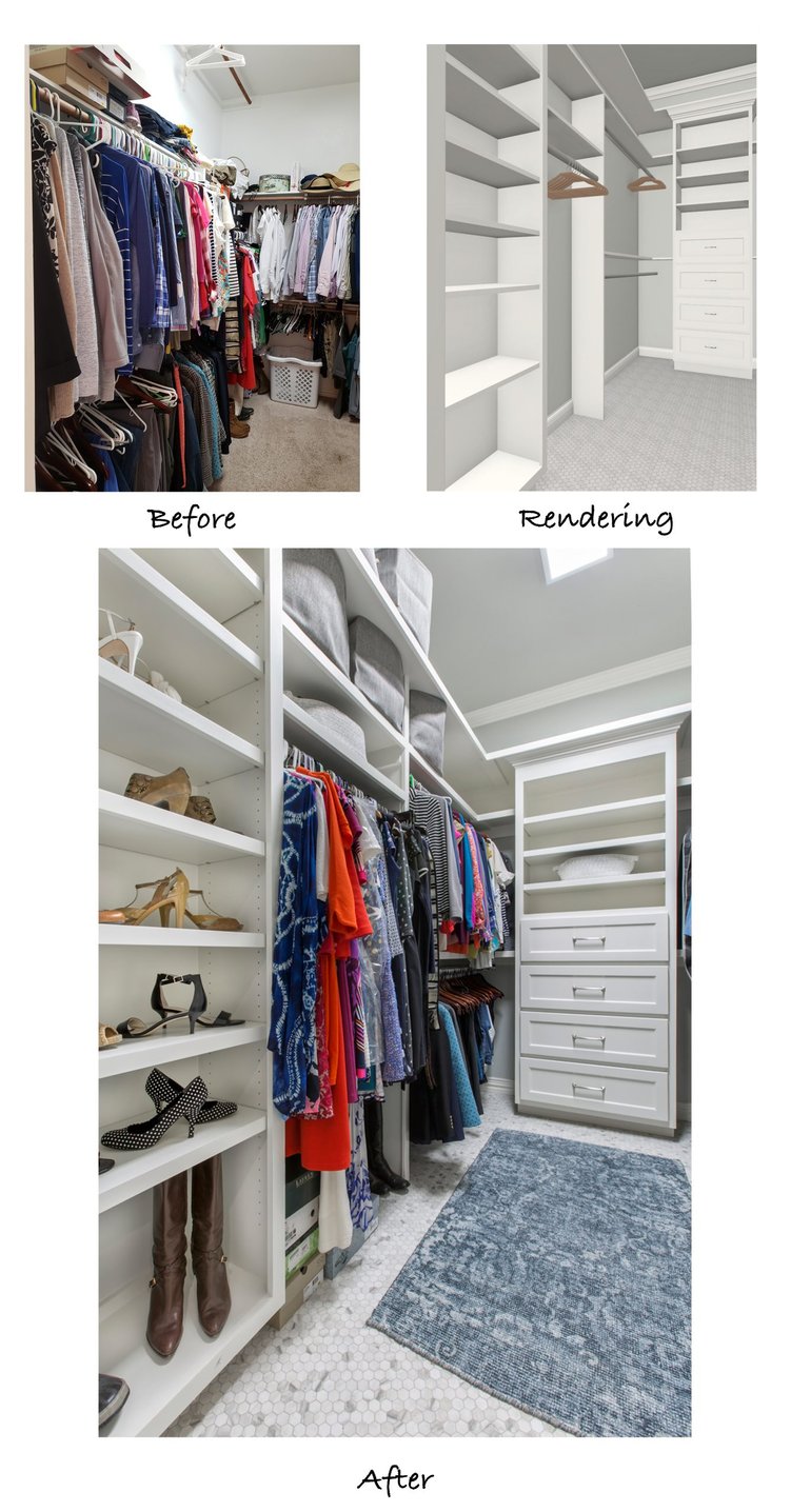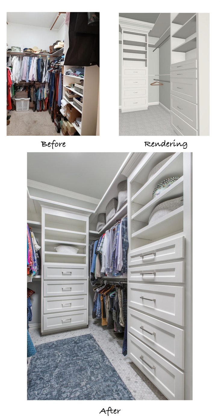 Drawer space, double hung closet rods, and adjustable shelves allow the clients to make the closet work for their storage needs without wasting any of the available space. It’s amazing how much larger the closet feels to the clients now – even though the closet is the exact same size, the optimization of storage space makes it feel less crowded and like there is more room for everything!