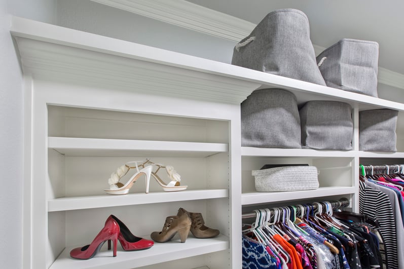 Our team loves to design closets! This is a common request we receive from clients that are remodeling their master bathroom or bedroom. For this project specifically, the existing closet did not have enough shelving for the client’s shoe and hat collections. They loved the idea of having an organized spot for everything, so it made perfect sense to take advantage of the available space and extend custom built-ins all the way up to the ceiling.
