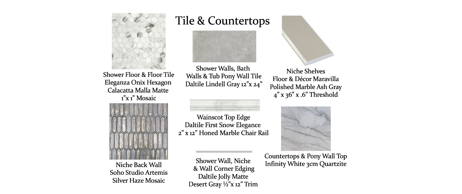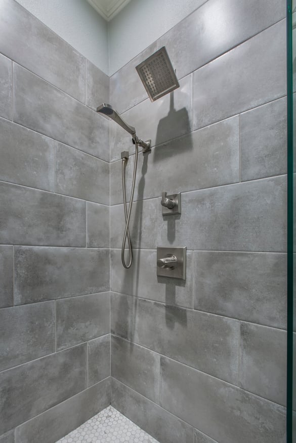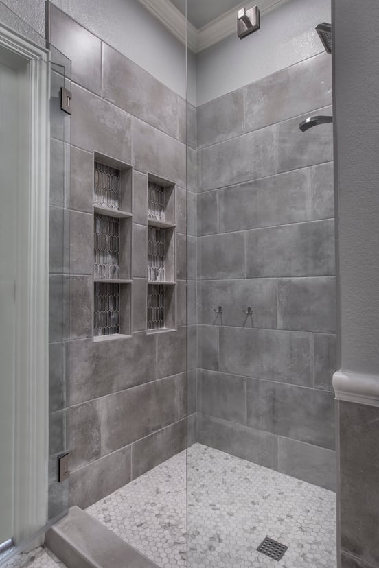 12”x24” Daltile was used on the shower walls, with decorative mosaic tiles inside the shampoo niches. The same tile flooring as the rest of the bathroom was installed in the shower floor to provide consistency in the design.