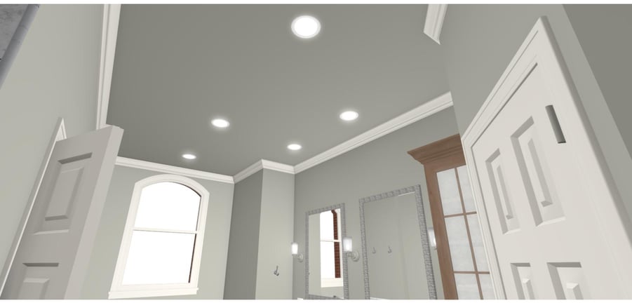 Strategically placed LED can lighting provides a bright atmosphere in the vanity area and above the remodeled shower. Crown moulding was added at the top of the walls, accenting the leveled 9-foot ceilings for a more finished look.