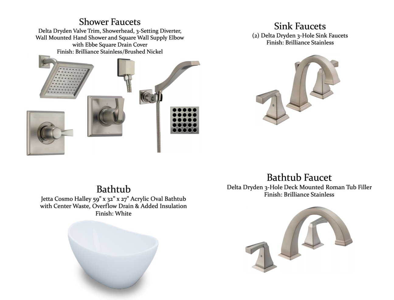 A sleek Delta showerhead and wall-mounted hand shower in brushed nickel also tie in with the hardware and color scheme.