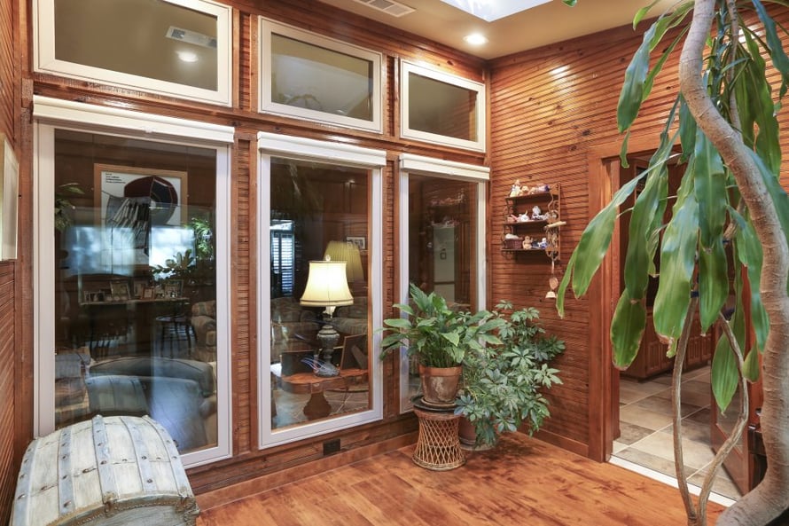 Stained French doors were installed as an entrance to the sunroom from the atrium, which was previously the back porch. Sunlight floods this area as well, through a large skylight we installed. What a beautiful view to look out the living room and see this atrium leading to the new sunroom!