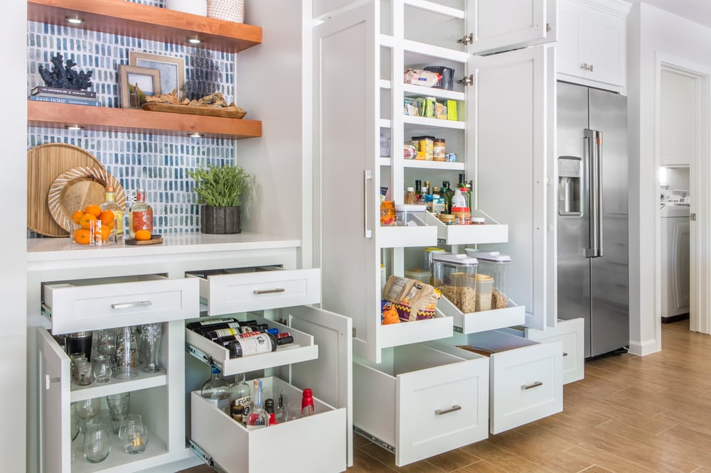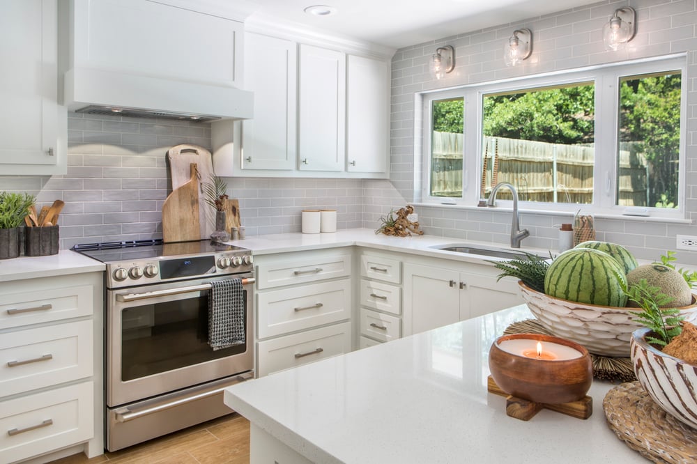 Another one of the items on our clients’ wish list was open shelving where they could display decorative accents and memorabilia from the beach. Our designers were able to include two shelves to the right of the sink, balancing the wall with the windows and creating some division between the kitchen and the breakfast nook.