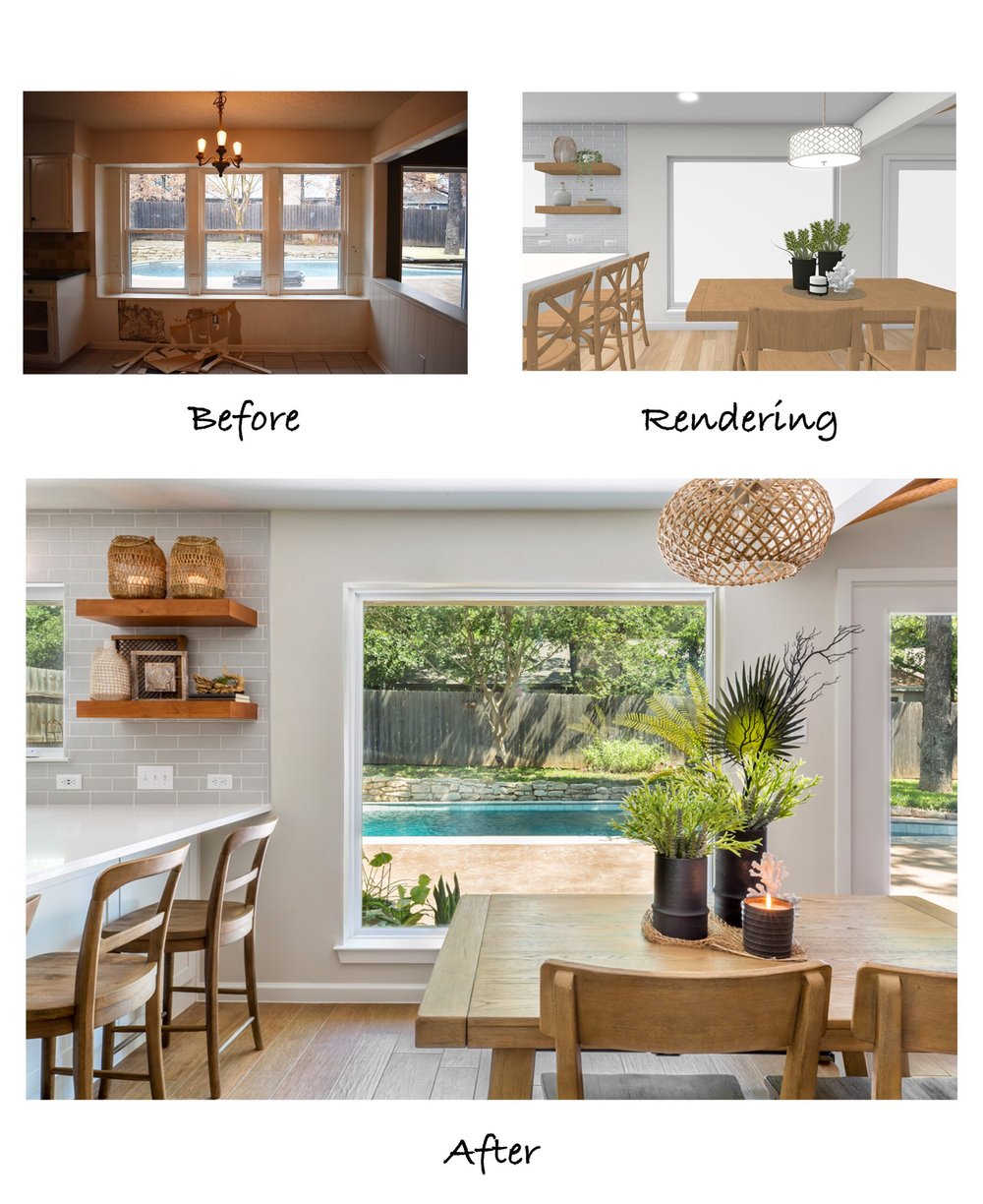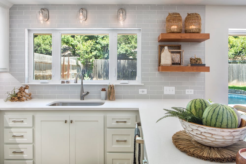 Looking into the new kitchen, the most striking change is the brightness of the room. The corner sink was relocated to the back wall, with a great view of the pool when doing dishes or meal prepping. Not only was this change important for our client to be able to watch her kids in the backyard, but the larger windows really made a difference in the amount of light in the kitchen.