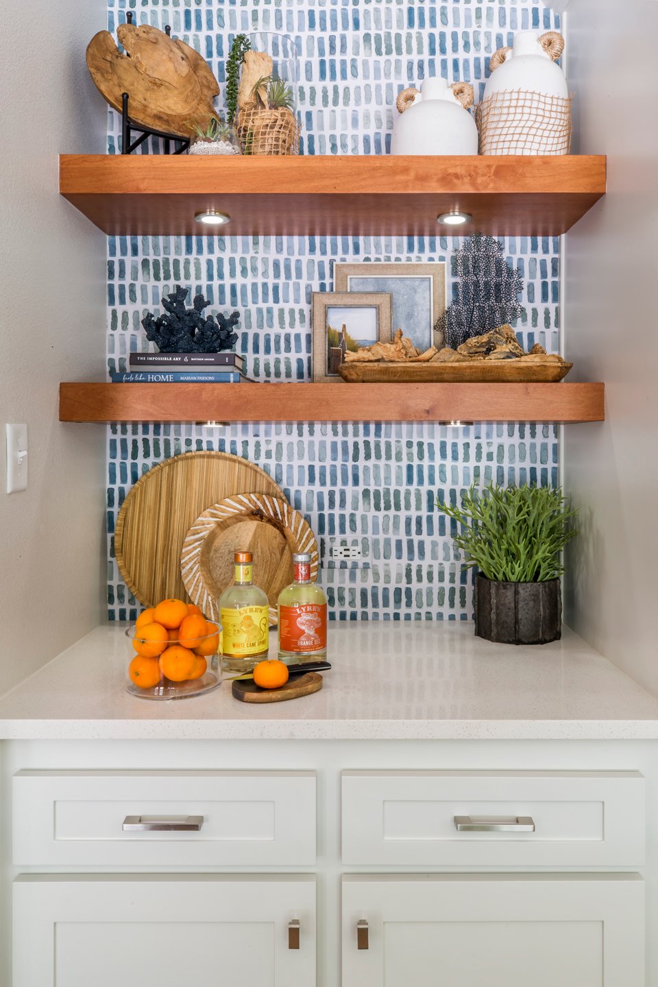 The beverage center is one of our client’s favorite features of their new kitchen! Chunky wood shelves with LED accent puck lighting provide the perfect display space for trinkets and dishes. Our client found several inspiration photos of patterned wallpaper and absolutely fell in love with this blue print! The color scheme and style are a perfect match for the coastal aesthetic and showcase a fun pop of personality in the remodeled kitchen.