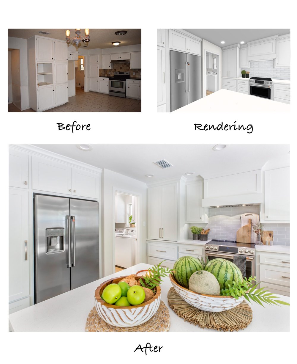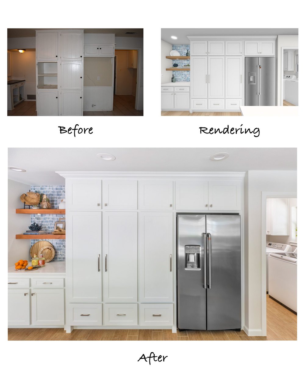 Along with updating the kitchen, the clients wanted to refresh the small laundry room and also remove the wall between the kitchen and living room for a more open layout. The wall removal required leveling the sunken flooring in the living room, widening the doorways, and removing the wainscotting from the walls. The entire center of the house was getting a much-needed refresh!