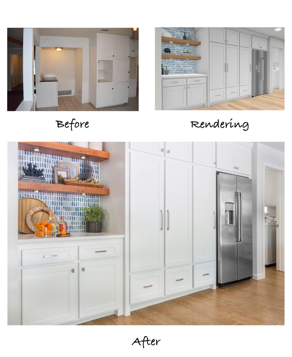 The original kitchen included a bar area that the clients never used. Removing it allowed for a longer wall of cabinetry beside the fridge and a custom beverage center. The view from the living room shows how much longer this stretch of wall feels in the spacious new kitchen.