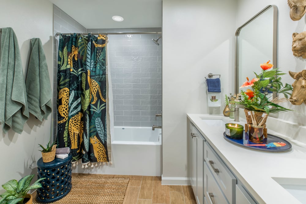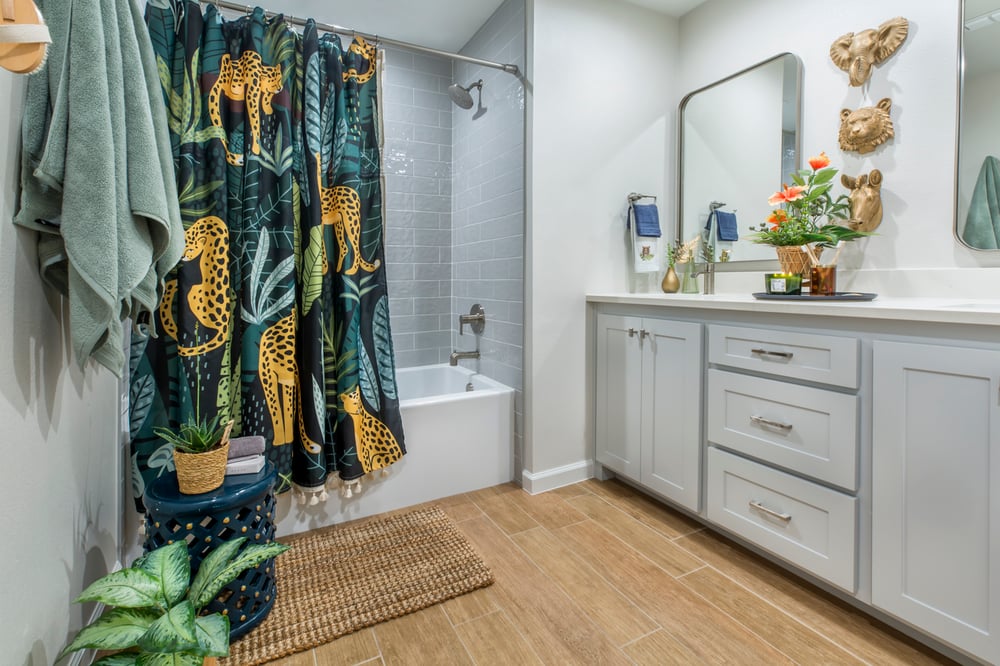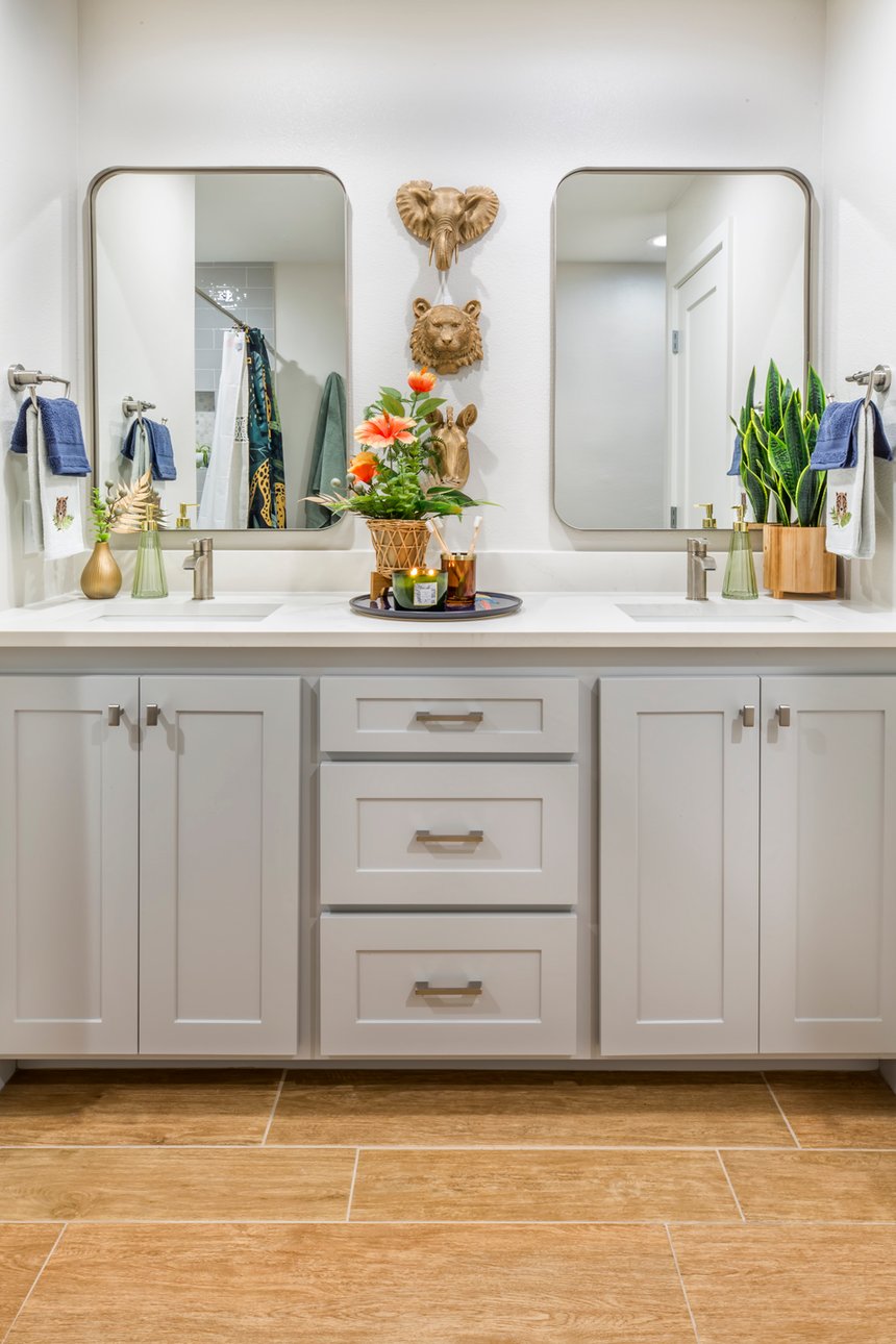 The neutral gray and white color scheme offers the perfect palette for swapping out décor as the kids grow up. The blues, greens, and golds of the “jungle theme” décor create a fun space for the little ones now and can easily be updated to a more mature look when the time comes – without the need to remodel again!