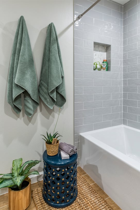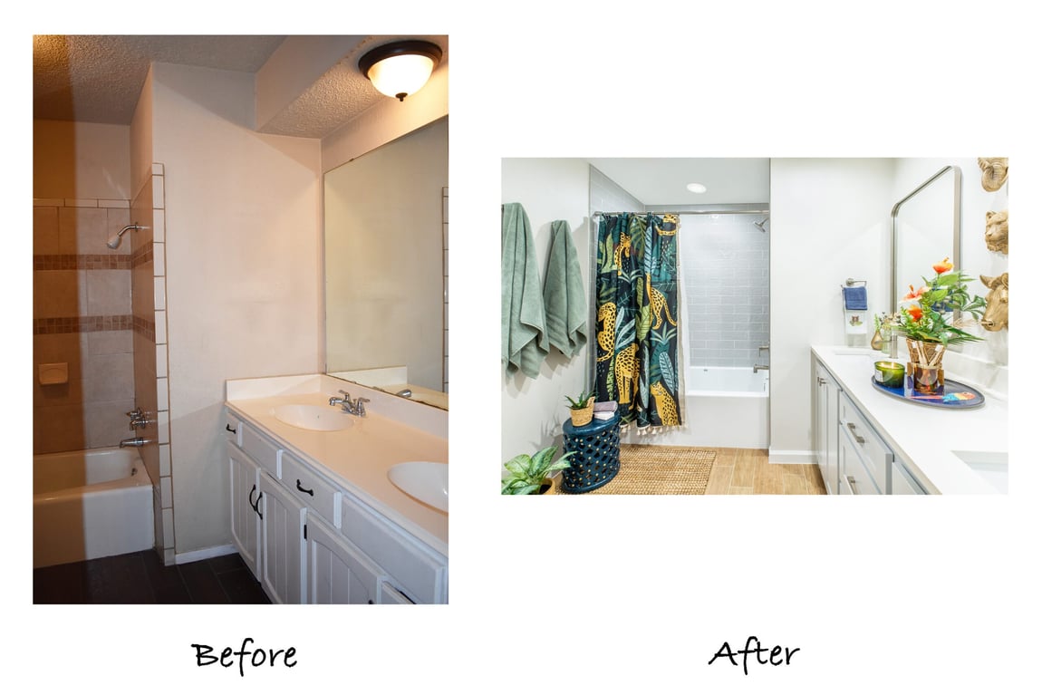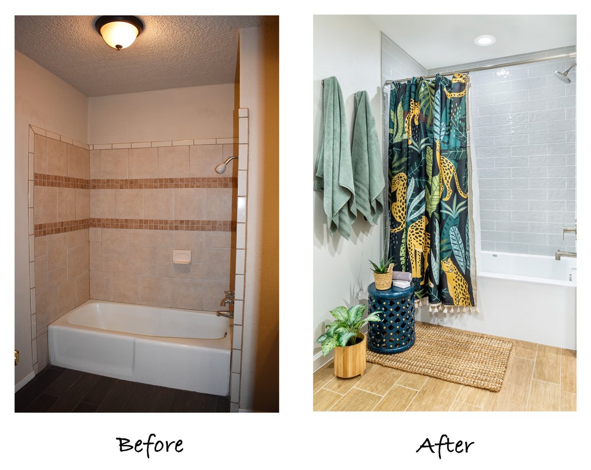 The room was completely gutted, and a sleek new tub and modern subway tile replaced the original tub/shower. The clients opted for a similar tile to what was used in the kitchen and chose to have it installed all the way up to the ceiling to make the room feel larger. The dated popcorn ceilings were scraped, and strategically placed LED can lights were installed. The new flooring also matches the kitchen and living areas and really helps brighten the small bathroom.