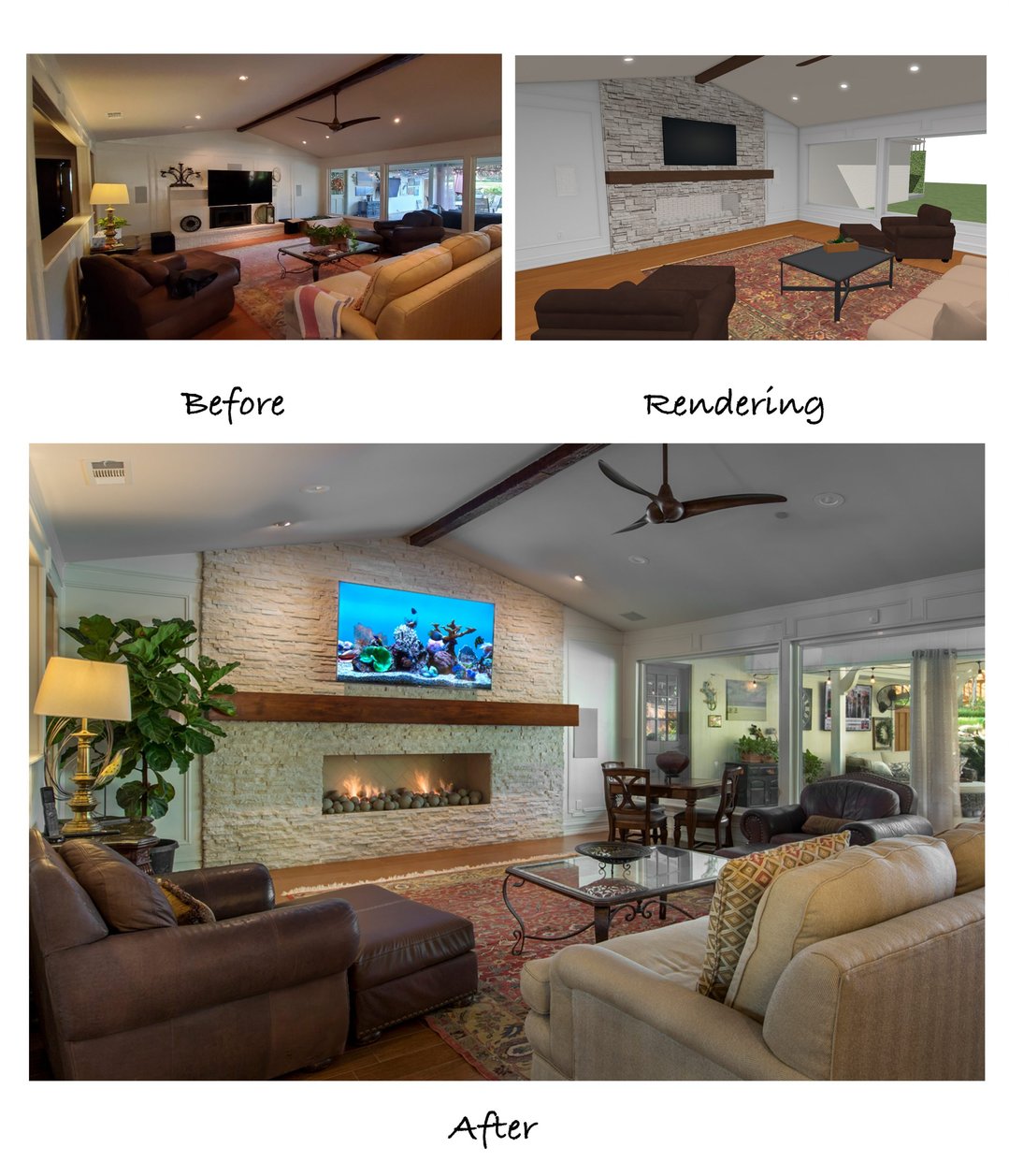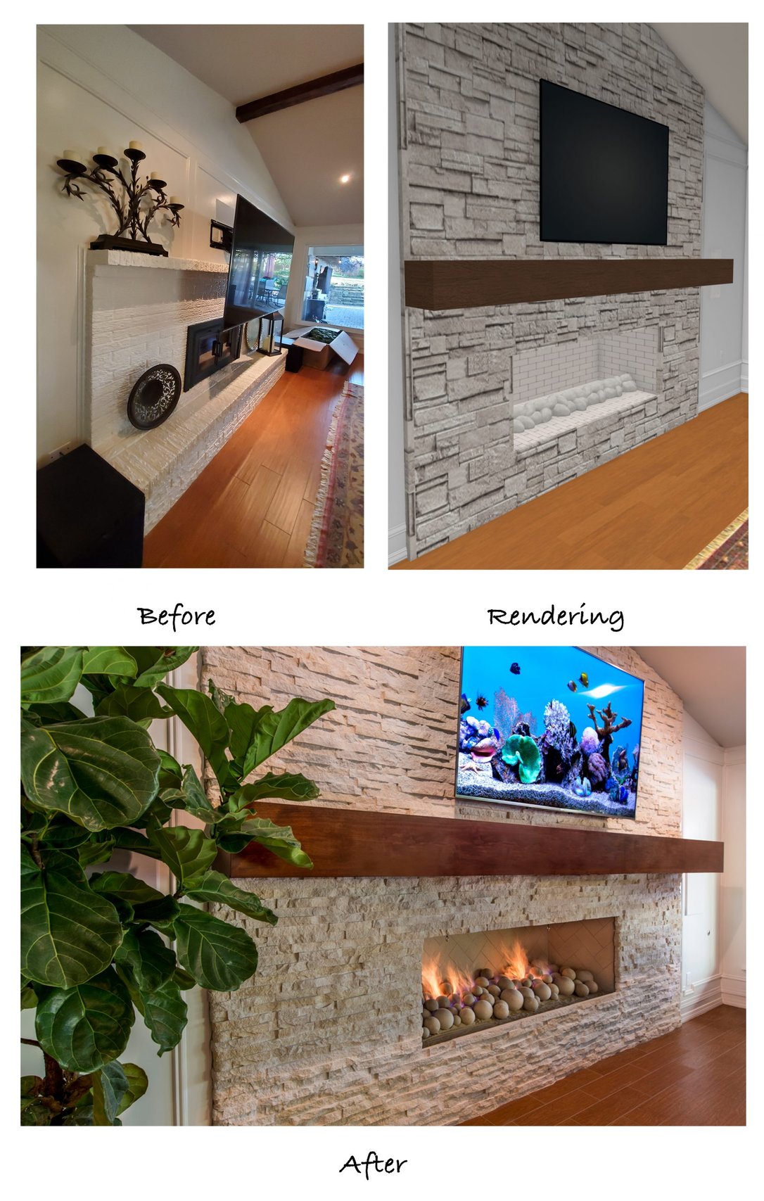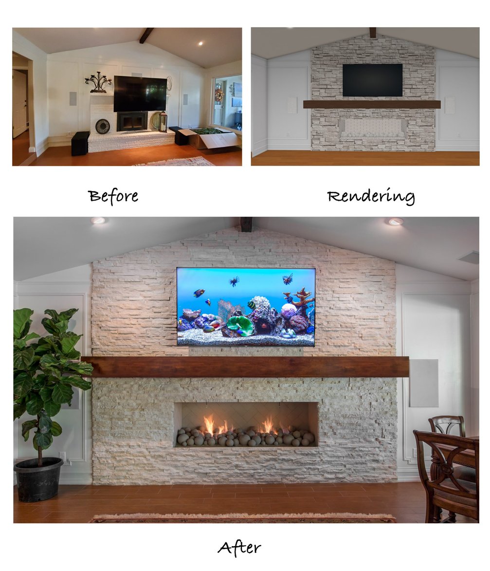 The 3D renderings show what the finished project would look like compared to the original fireplace. Our clients love that the stone was extended all the way to the ceiling, making the room look larger. The large stained mantel ties in beautifully with the flooring and exposed beam of the cathedral ceiling.