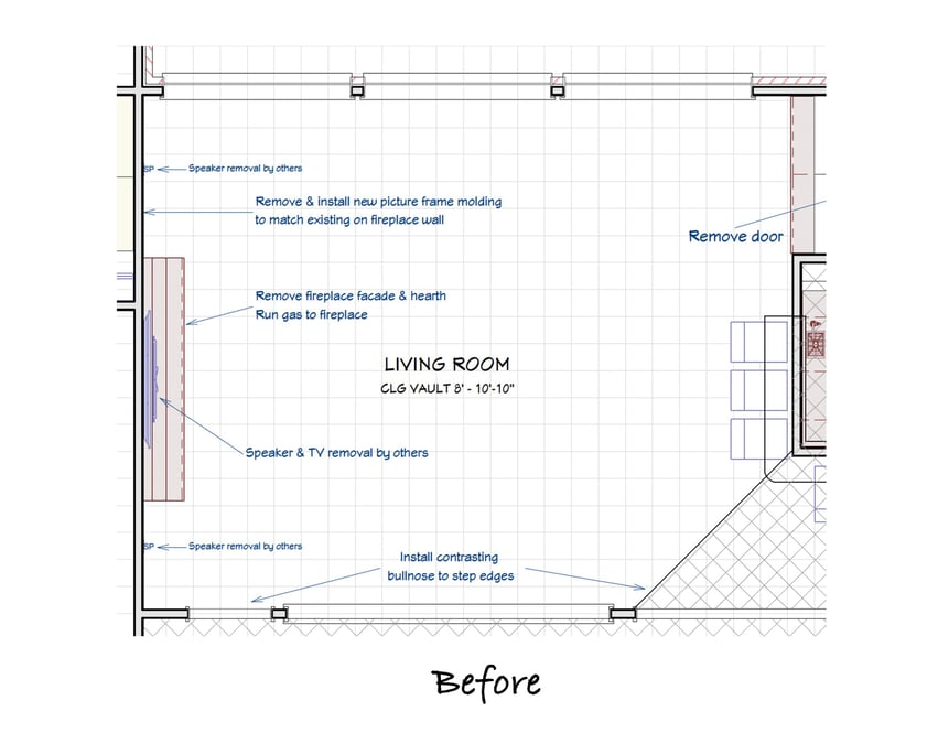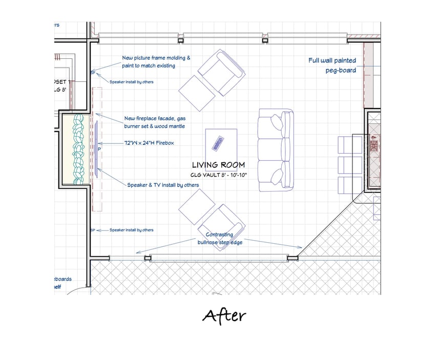 Their existing fireplace was a pretty good size, and they knew they wanted the remodeled one to be even bigger. Our designers got to work drawing the new fireplace based on their discussion and inspiration photos provided by the clients. Just as with their previous projects, it was extremely helpful for the clients to be able to see the plans and 3D renderings so they knew just how the finished space would look.