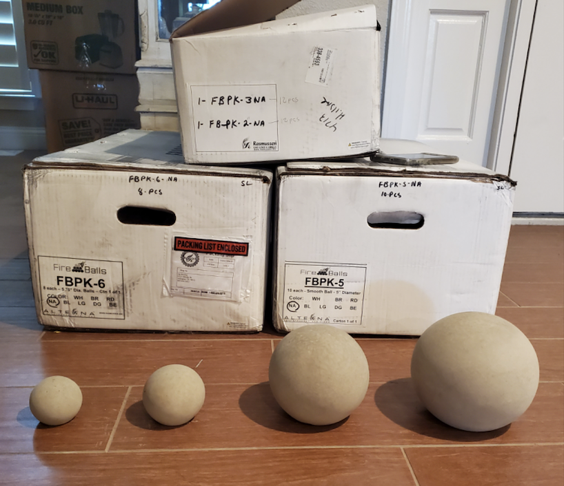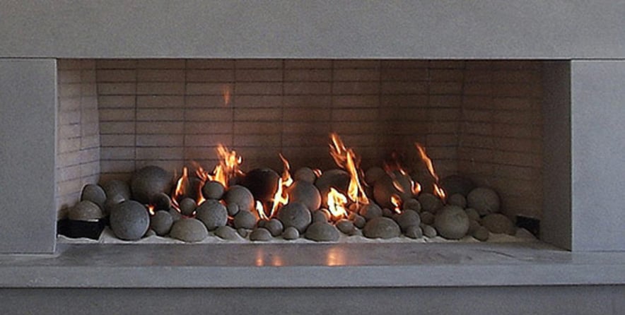 Rasmussen FireBalls are made from the same high-heat resistant ceramic-bonded refractory material used in the making of their gas logs. They are available in uniform sets or mixed sizes, and also come in a variety of colors. Our clients chose the mixed-sized set in a tan/natural color. This feature creates a visually interesting, modern alternative to regular gas logs.