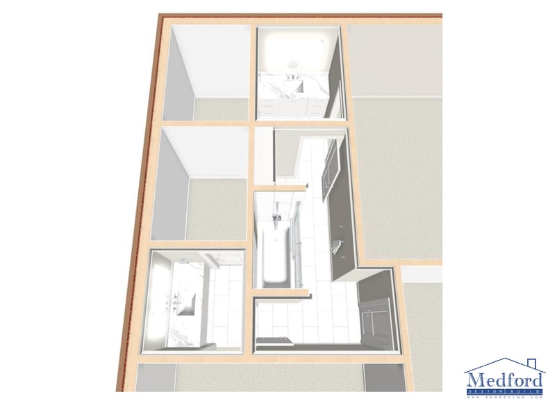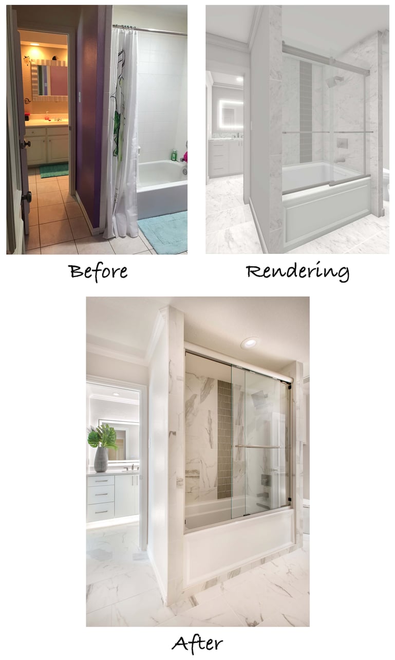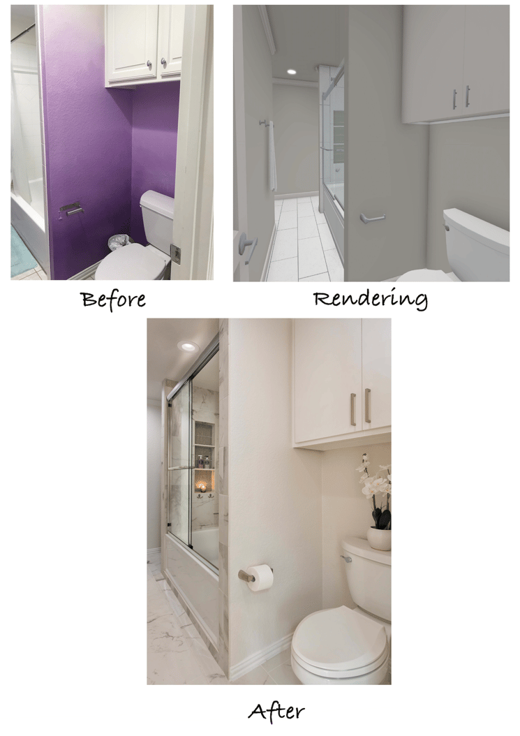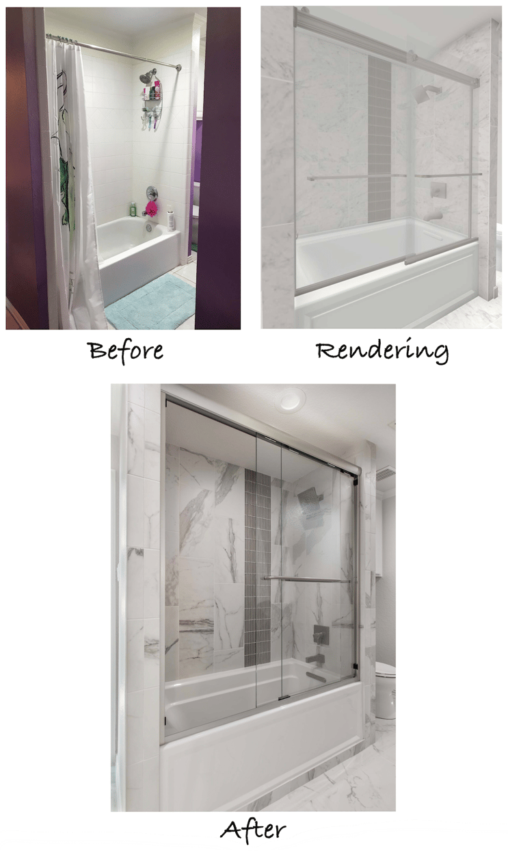 The original bathroom was fully functional for the daughter, but the look was a bit dated for her taste. A more modern and sophisticated aesthetic was the goal. She had a good idea of the colors and materials she wanted to use and communicated it well to our designers. Our team created realistic 3D renderings to showcase the structural and aesthetic changes to be made.