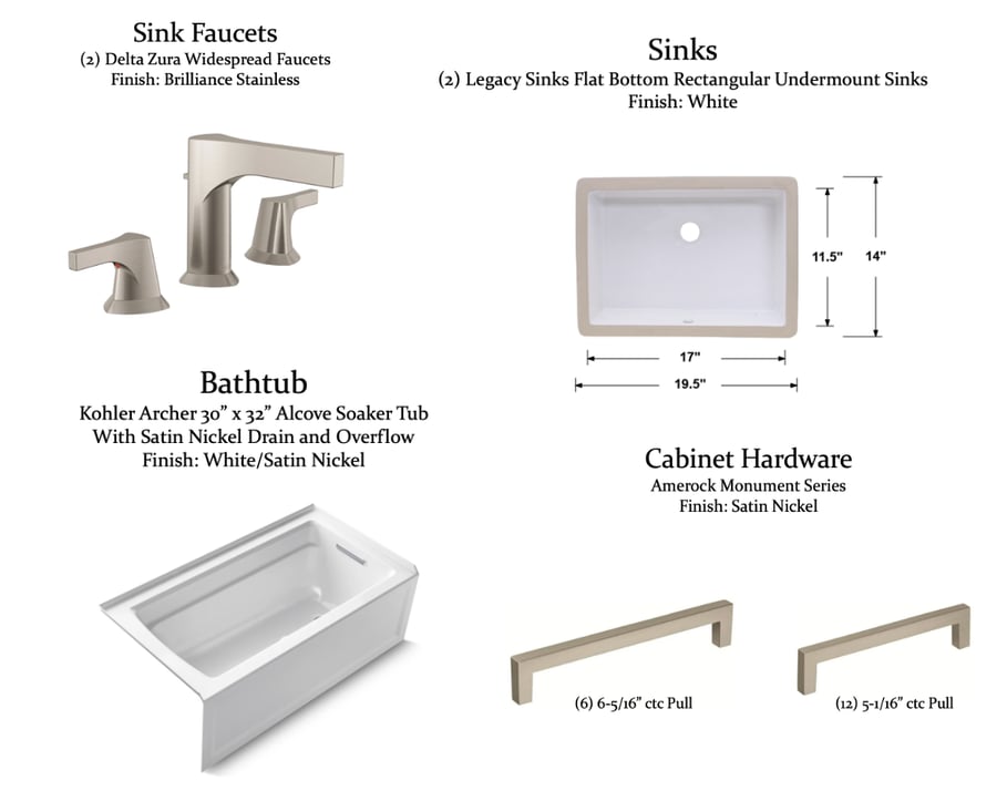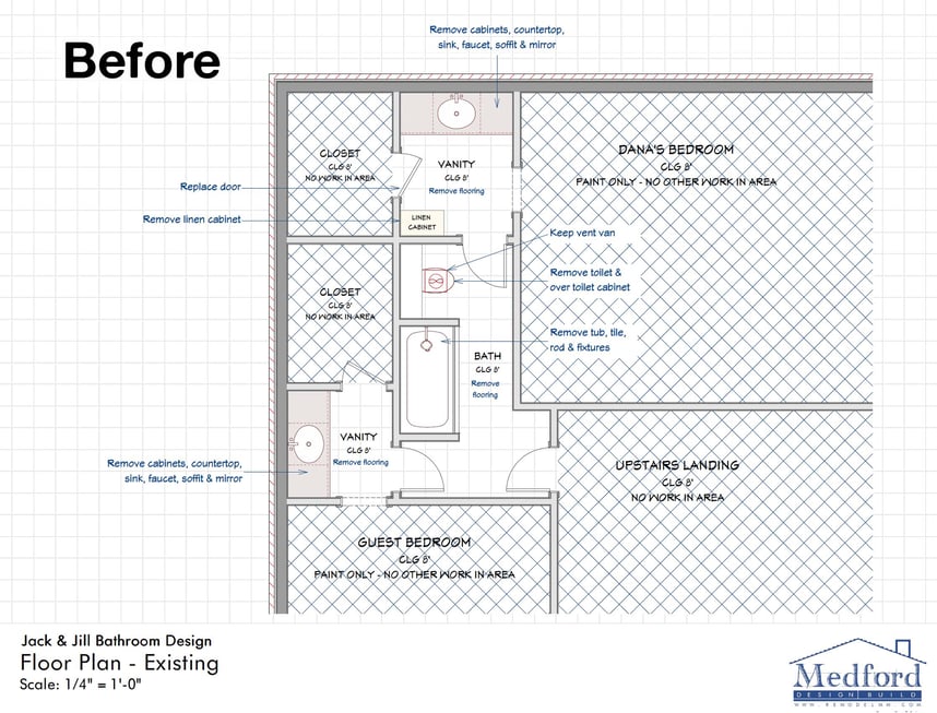 As the floor plans show, the layout stayed the same, with all of the key components and walls remaining in the same location. One structural modification that was to be made was the removal of the linen cabinet behind the closet door in the first vanity area. It was not utilized and got in the way of the swing of the door. Removing it made the vanity area feel much larger. We also removed the soffits above both vanities to open up the wall and make the ceilings feel higher.