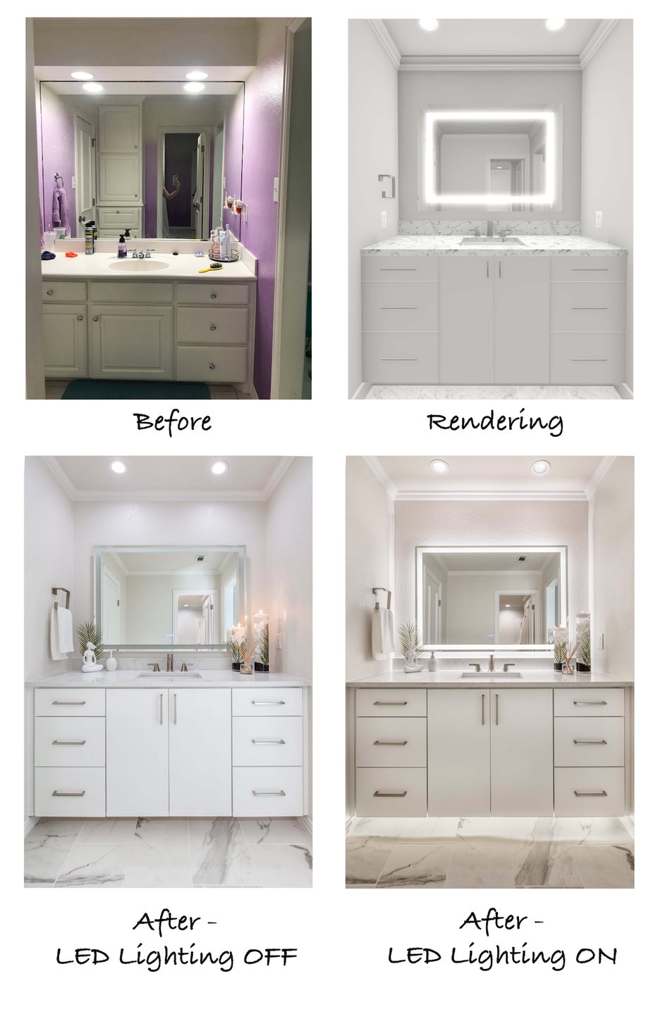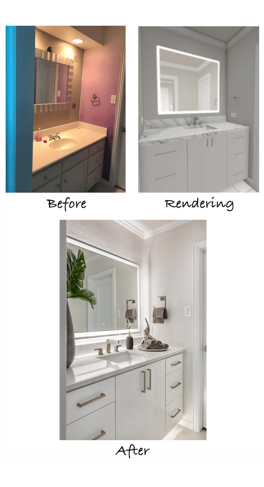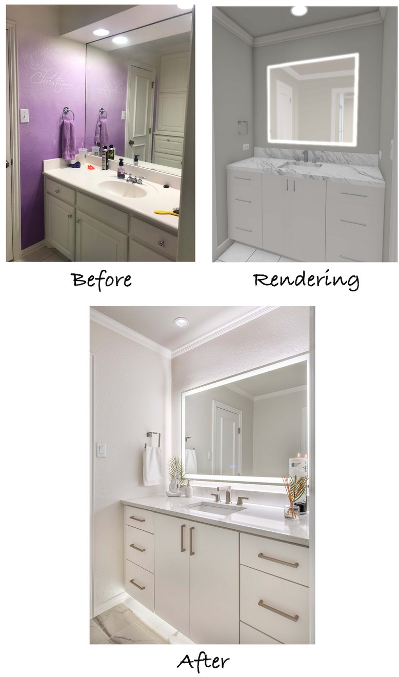 The renderings of the vanity areas show the removed soffit, painted walls, new vanities, countertops, flooring, faucets, and under-mount sinks.