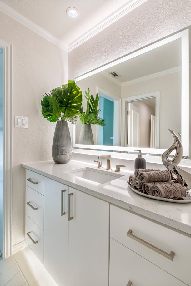 This shot shows the difference the LED lighting makes in the first vanity area. Strategically placed can lights were installed above the vanity where the soffit was removed and can be used with or without the mirror and toe kick LEDs.