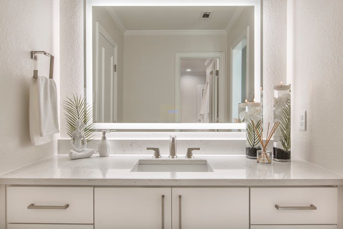 Our clients were especially excited about the LED lighting feature in the new mirrors we installed, along with the toe kick below both vanities. This neat accent lighting has 3 different settings for shades of white, along with colors that can be changed with a remote!