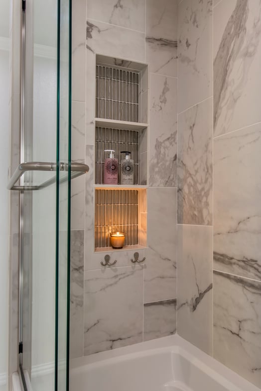 At the left end of the shower is a large, 3-tier shampoo niche, perfect for soaps, bottles, and candles. Two small hooks were also added to hold wash rags or loofahs.