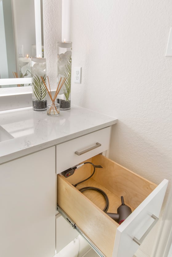 Another neat feature of this bathroom is the convenient outlets installed inside the deep, stacked drawers. This provides easy access and storage for hairdryers and styling tools without having to clutter the countertop.