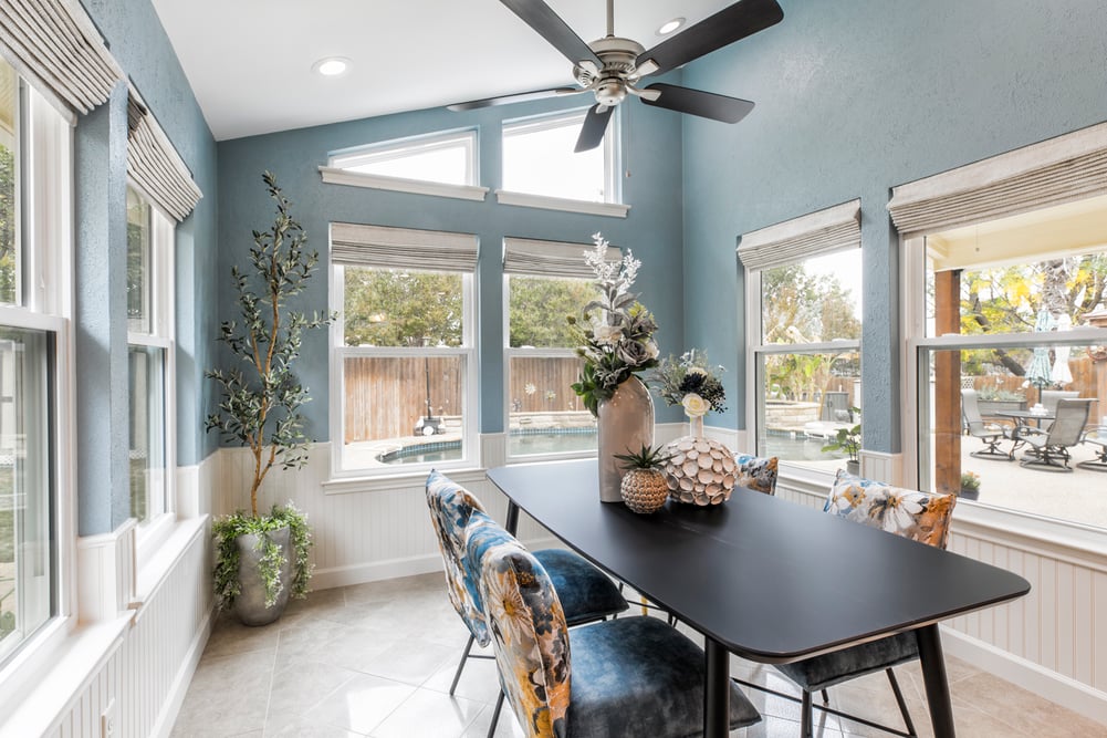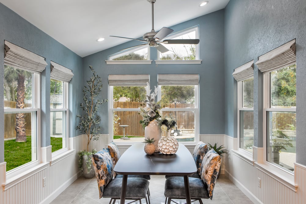 The new sunroom doubles as the breakfast nook and fits their dining table comfortably! It was important to the clients that the ceiling in the addition was vaulted to follow the roof line, so our designers made sure to incorporate that feature.