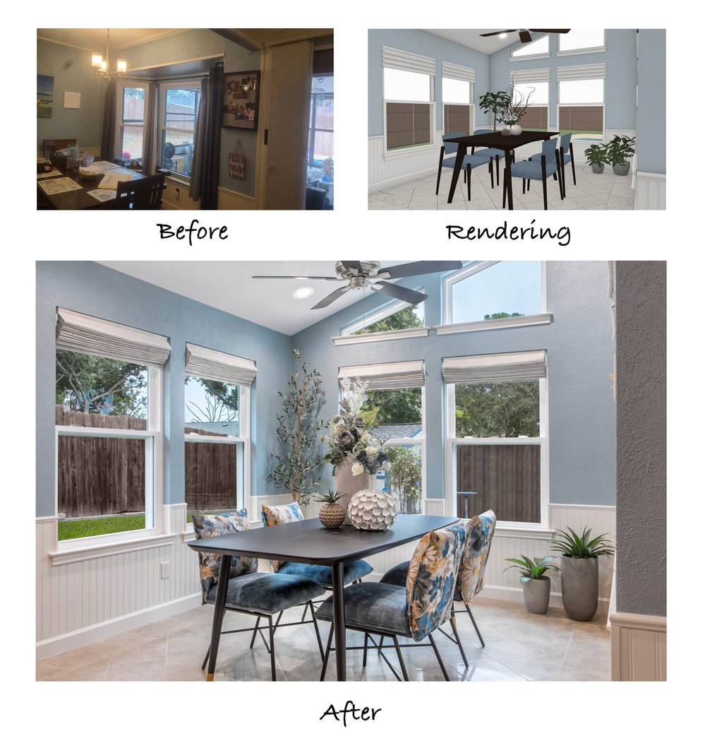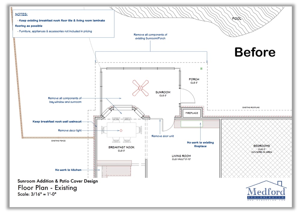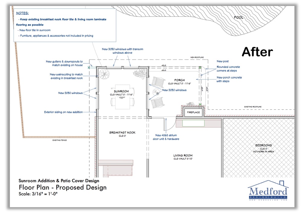 The before and after floor plans show the removal of the original sunroom and the space it freed up to extend the breakfast nook. Not only did this allow for additional interior space, but also a half-covered patio outside.