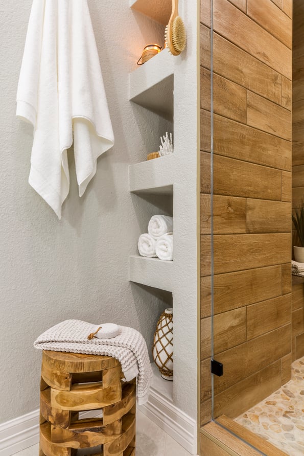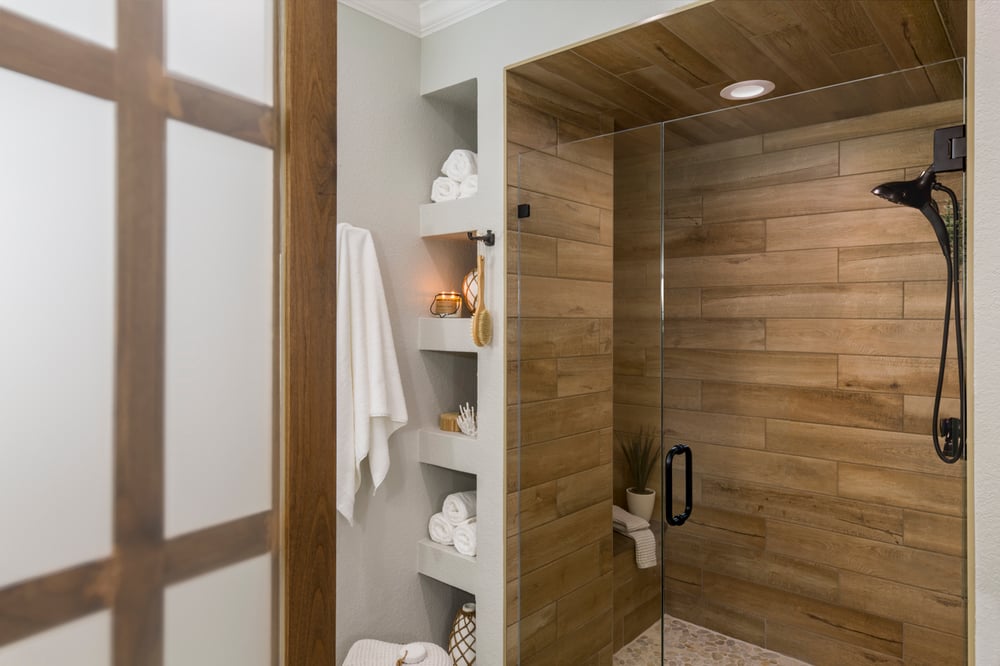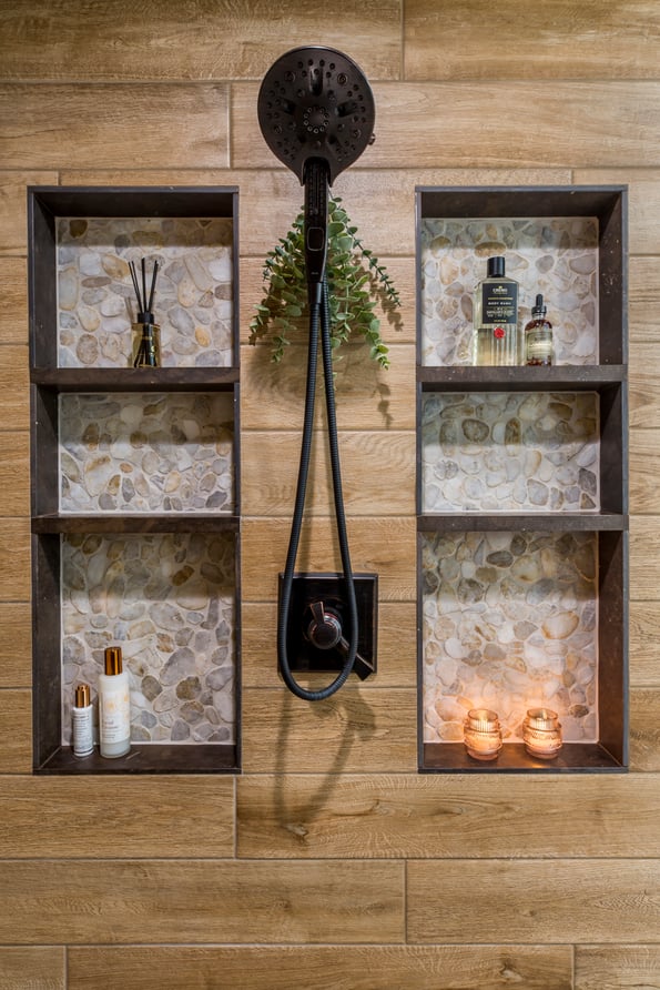 Inside the shower are two extra-large niches to hold all of the soaps, shampoos, bottles, and candles. To tie in with the design, the same sliced pebble tile was used in the niches as on the flooring. The variety of warm tones and natural textures pair so nicely with the wood grain of the walls.