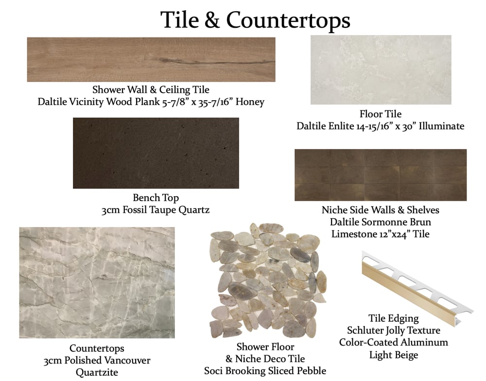 Our designers also included a small bench in the new shower. 3cm Fossil Taupe Quartz was used for the bench top to match the niches and bronze hardware.