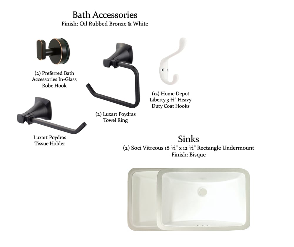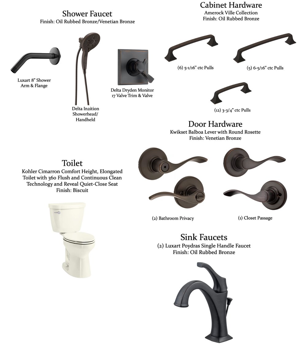Dark Venetian bronze hardware was used in the shower and throughout the bathroom. The rich contrast compliments the color scheme without feeling distracting.