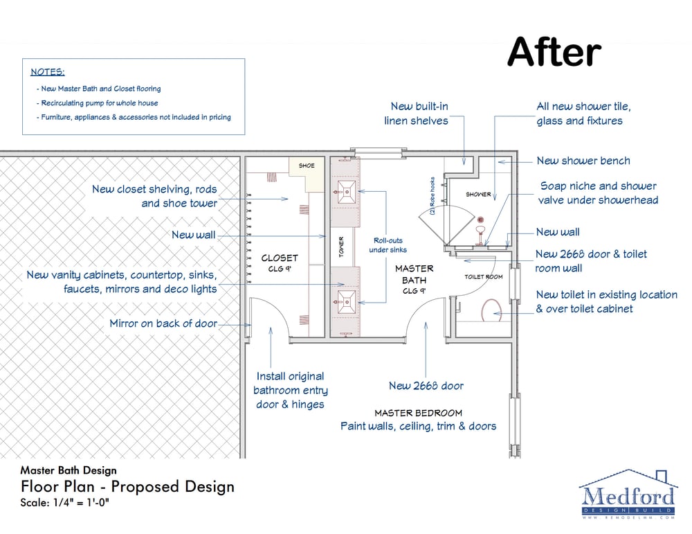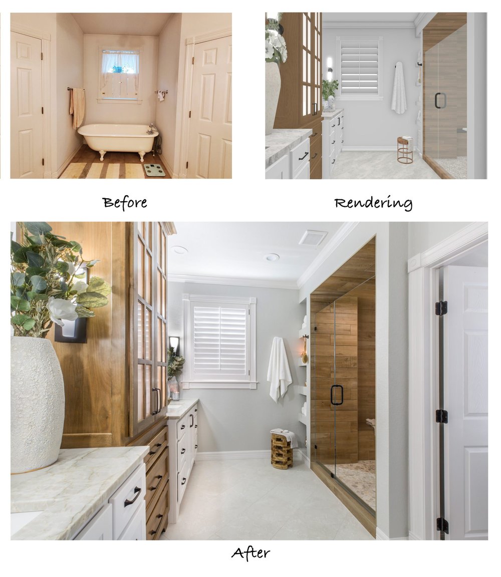 The floor plans show that a wall was added to create a large closet with bedroom access. The new closet took the place of the original closet and the small shower. This wall also provided a new location for the vanity. Because the vanity was relocated, we were able to install a wider entry door to the bathroom – ideal for aging in place! The unused clawfoot bathtub was removed, and a spacious walk-in shower replaced the second closet on the right.