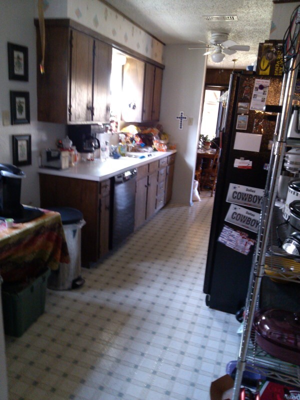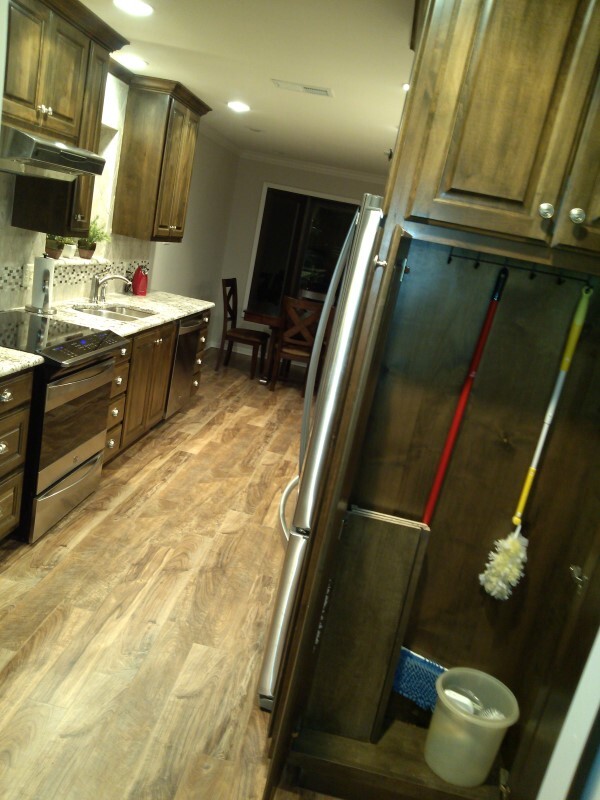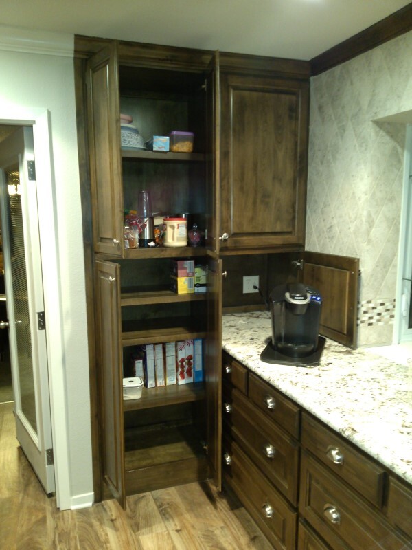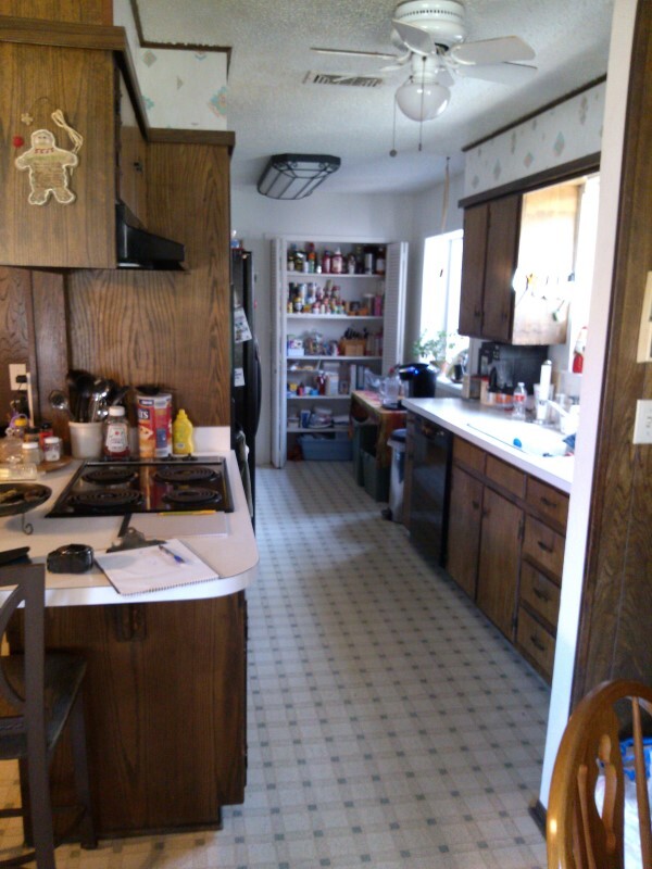To make the space feel larger, the upper cabinets over the bar, the fir downs over the wall cabinets, the short wall at the end of the cabinets, and the ceiling-mounted fans and lights were all removed. The cabinets were extended down to the pantry and a cabinet pantry was built to utilize the space more efficiently.