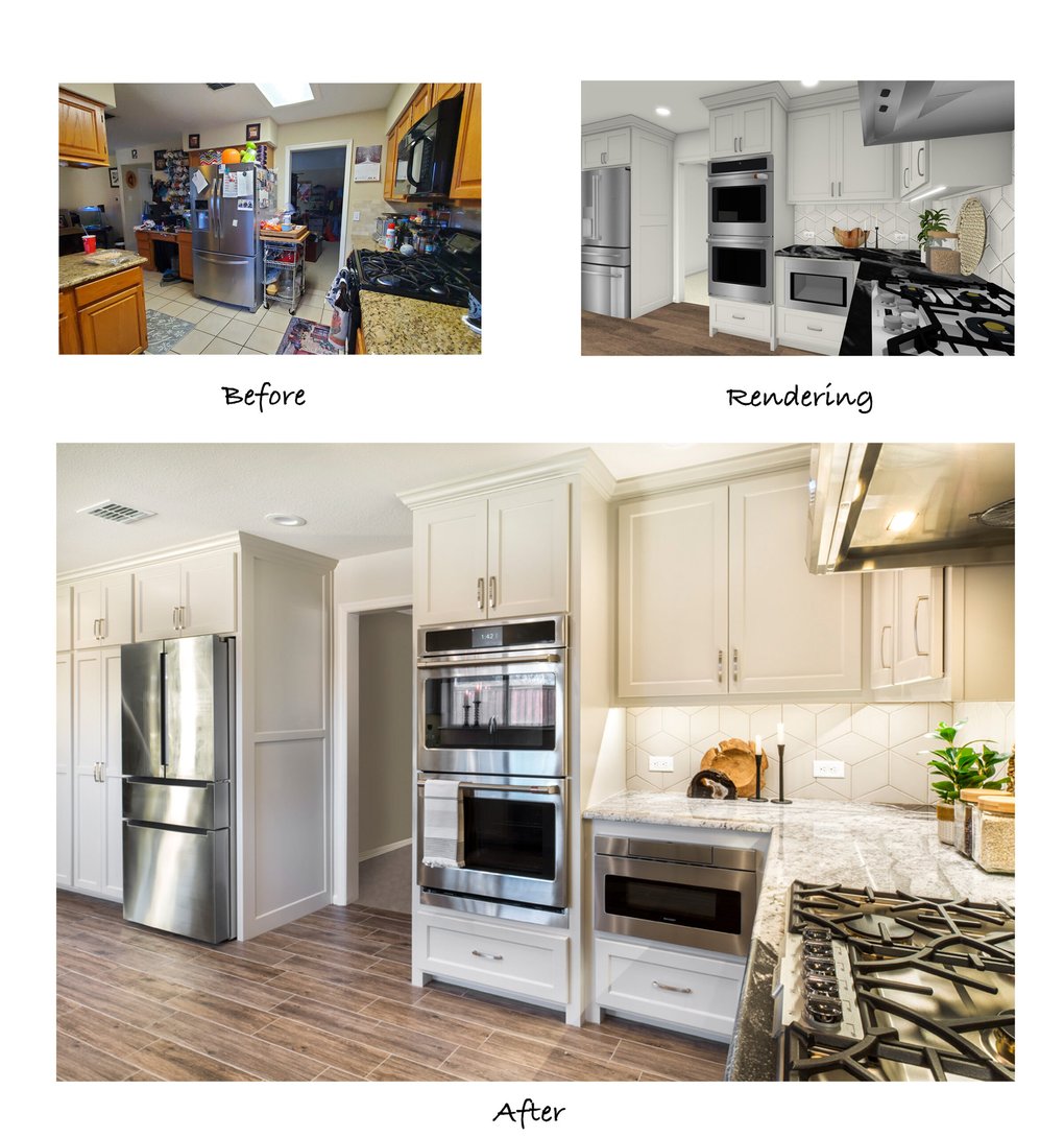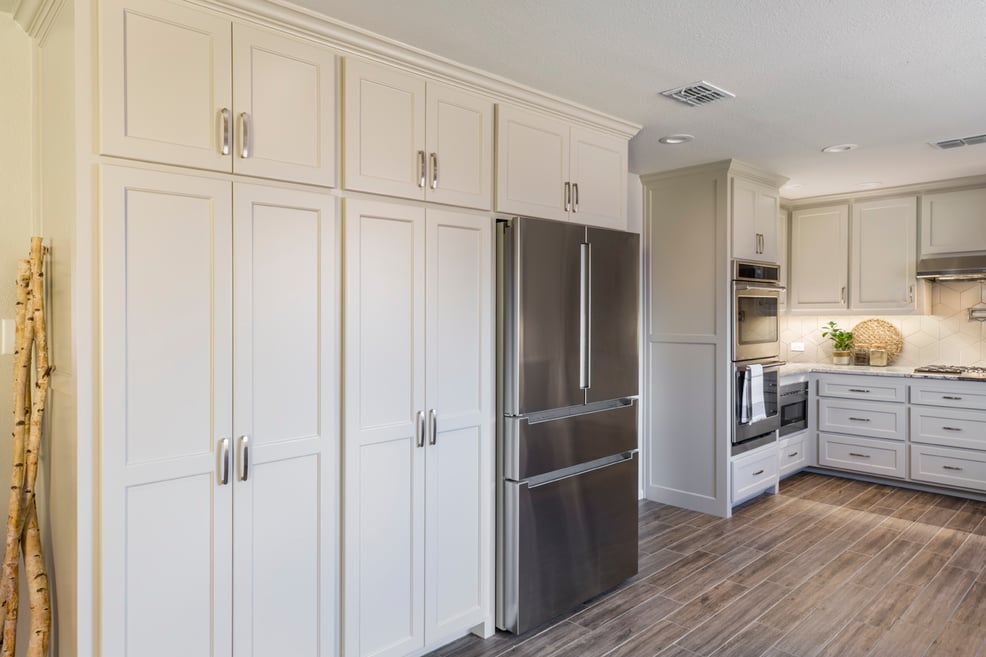 The custom cabinetry around the refrigerator provides a high-end look and ample storage space along the left side of the kitchen, where an unused built-in desk once sat.