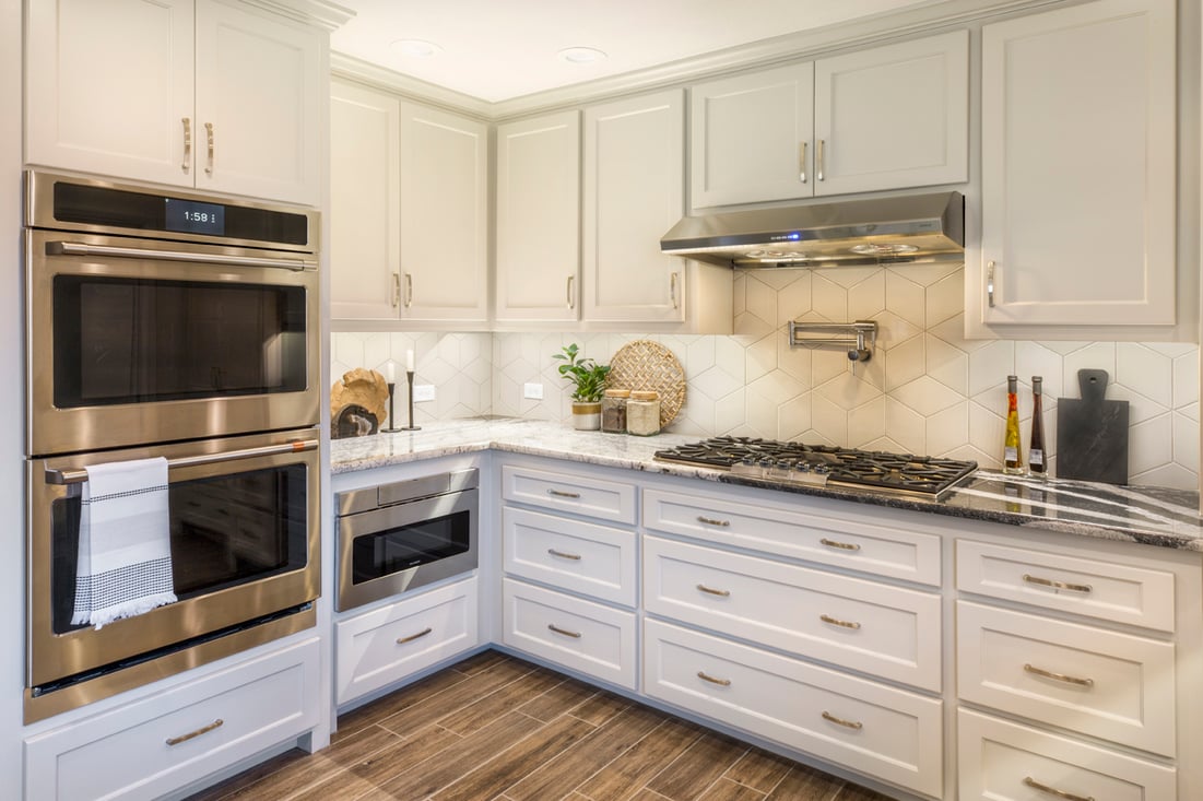 The clients also noted that they wanted stacked double ovens to accommodate more cooking, along with a sleek microwave drawer. We love how this corner became the ideal cooking space for a chef with all of the appliances and utensil drawers close by!