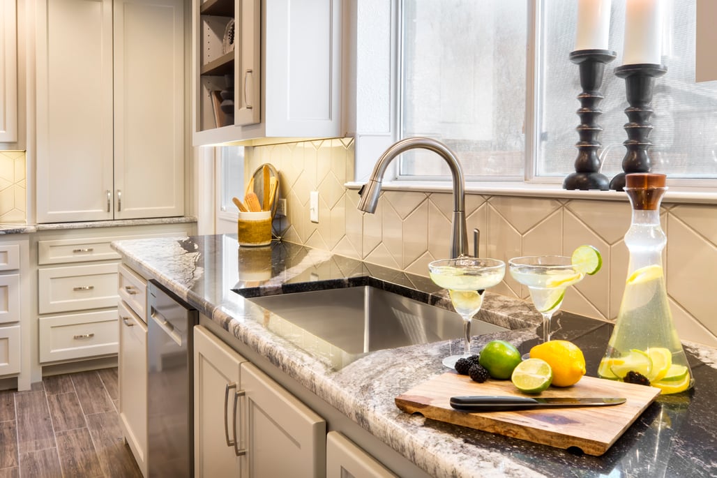 Bright LED undercabinet lighting spotlights the 6″ x 10″ rhombus-shaped backsplash tile and stunning polished 3cm “Sky Fall” granite.