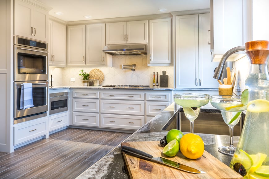 Because the back wall was pushed back several feet into the previous laundry area, the kitchen itself is longer. The walls also feel higher, as the soffits were removed and the cabinetry was extended up to the ceiling. This created additional storage space in the upper cabinets along with a uniform look.