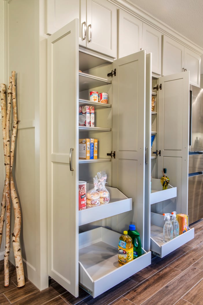 These floor-to-ceiling cabinets house 2 extra deep cabinets with roll-out pantry shelves and adjustable shelving. This is a beautiful alternative to a walk-in style pantry, and the roll-out shelves allow easy access to otherwise hard-to-reach items that might get pushed to the back of a traditional pantry.
