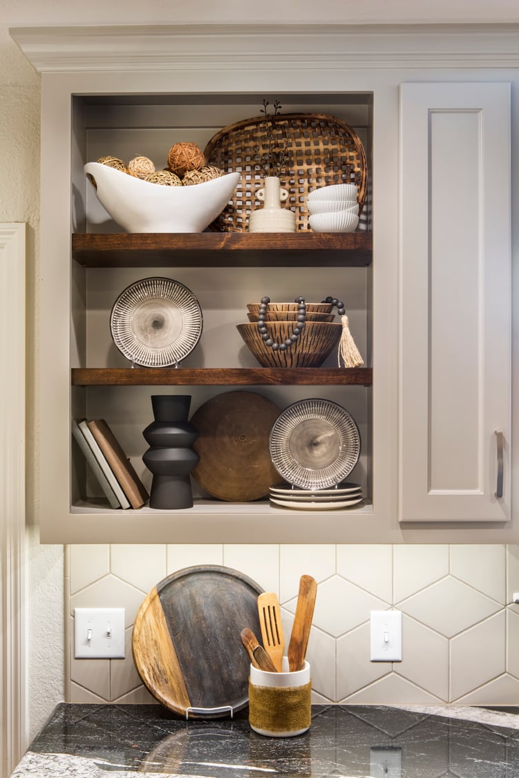 One of the custom features of this design was this section of open shelving in the upper cabinets. The clients liked the look of open shelving, but still wanted a cabinet-style upper. The solution was this beautiful display area that allows the clients to showcase different dishes and décor on stunning wood-stained adjustable shelves.