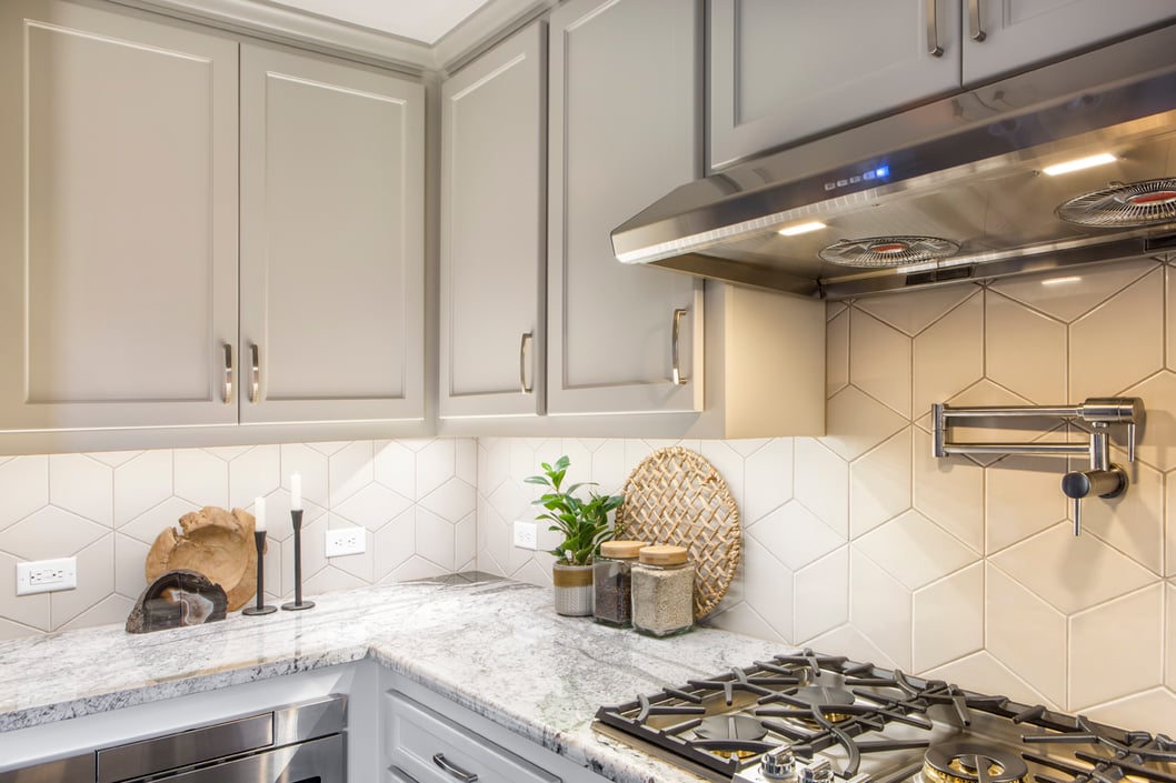 A matching stainless steel vent hood and pot filler were also installed for convenient access while cooking. These features tie in nicely with the neutral color scheme and brushed nickel cabinet hardware.