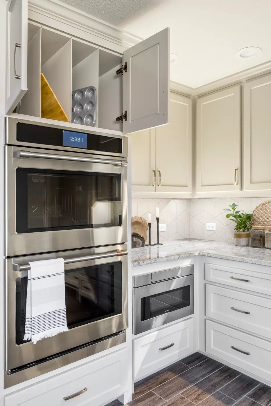 Speaking of a chef’s corner, our designers chose to include large cookie sheet dividers inside the cabinet above the double oven – just the place for large trays, cookie sheets, muffin tins, and cutting boards.