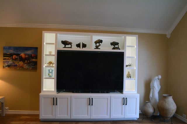 Our creative craftsmen put doors on the open cabinets and then built a frame of shelves to surround the TV. They also installed custom LED lighting in the shelves with an adjustable fader to control brightness of the display. What a beautiful statement this piece makes!