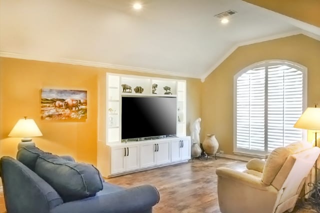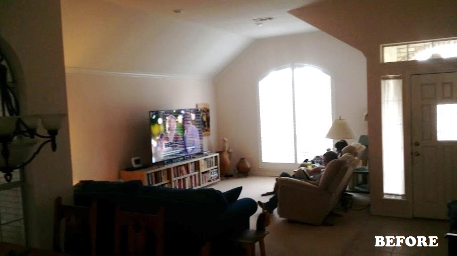One of the first things visitors saw upon entering our client’s home was a large television located in their family room just to the right of the entry. The massive flat screen sat atop some open cabinets and seemed overwhelming in such a small room. The clients wanted to make the TV look more like an attractive focal point instead of an overpowering detail.