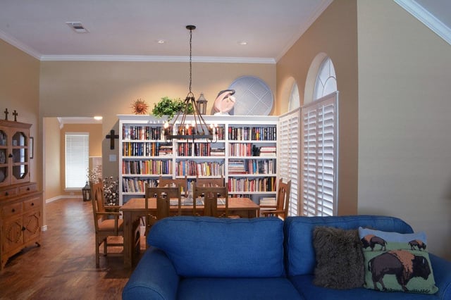 The next room the clients wanted to address was the dining area. The dining room wall had a cut out looking into the kitchen, which was not the best use of space. Our clients decided they would like to close that window and extend a bookshelf across the length of the wall. This would provide a creative way to display their book collection while adding visual interest to their dining and living room.