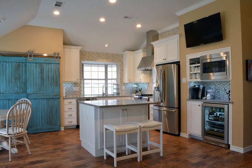 The remodeled kitchen includes the vinyl plank flooring and new paint used throughout the house, as well as new cabinetry and hardware, quartz counter tops, stainless steel fixtures and appliances, mosaic tile backsplash, can lights, a built-in beverage bar, a built-in microwave, a remodeled island with additional storage space and electrical outlets, a wall-mounted flat screen, and an expanded pantry with custom sliding barn doors.