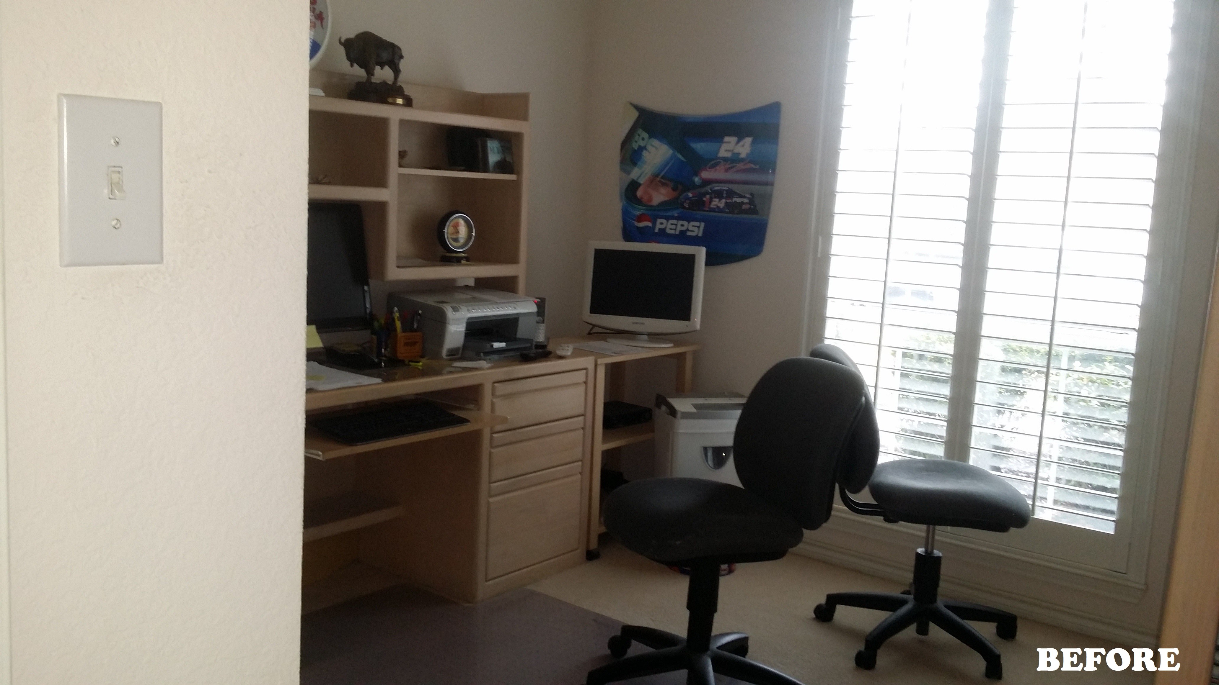 We also updated the client’s home office and guest bathroom. For the home office, the furniture was functional, but certainly needed some refreshing. We applied a fresh coat of white paint to the desk and the display case, which really stood out against the new wall color and flooring.