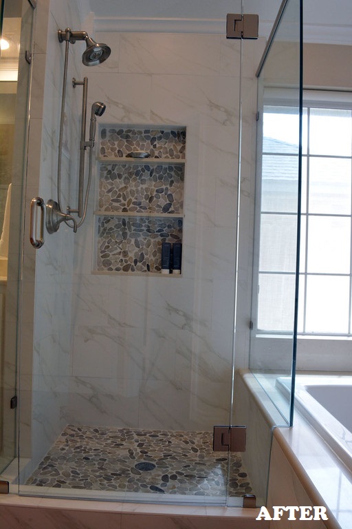 The client’s remodeled master bathroom includes an expanded and remodeled shower, complete with frameless glass, pebble tile, and marble. As for the tiny tub, it was replaced by a luxurious 6 foot soaker! They absolutely love their new spa-like bathroom!