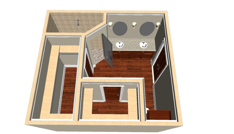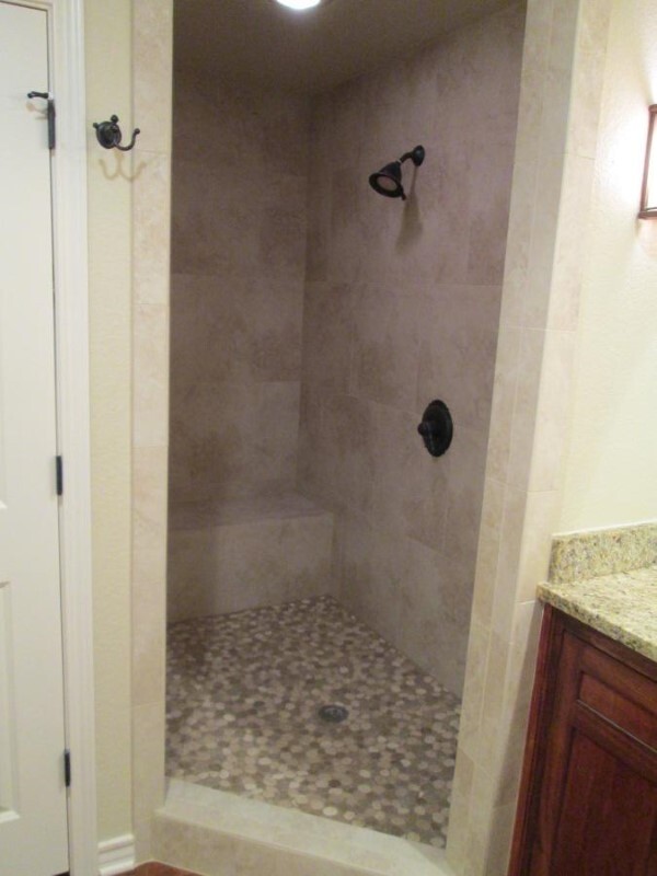This remodeled master bathroom incorporates customized colors, textures, and fixtures, along with an expanded shower for a relaxing, spa-like atmosphere.