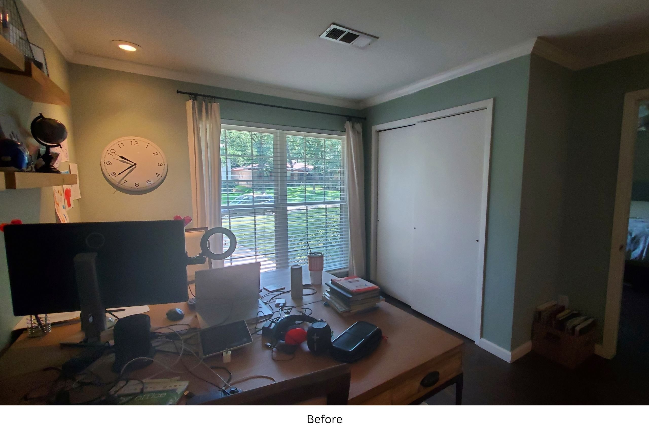 In addition to the kitchen, we reworked the home office space to improve privacy and flow. Previously, the master bedroom had entrances from both the kitchen and office. We closed off the kitchen entrance and reconfigured the office layout, including removing its closet and installing new doors. We also created a hallway from the foyer past the office to provide a proper entrance to the master bedroom.