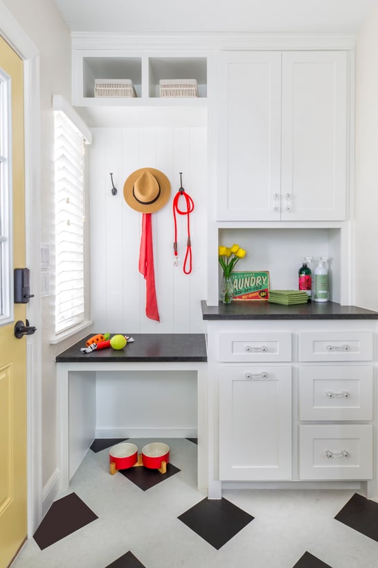 The portion of the laundry area across from the washer and dryer has been named the dog station. Our client wanted a space to feed her pup that was out of the way, and to store his toys and food without the clutter. Our designers gave her two countertop spaces, upper cubbies and cabinets, hooks for holding leashes and harnesses, and an opening below the counter for food and water bowls.